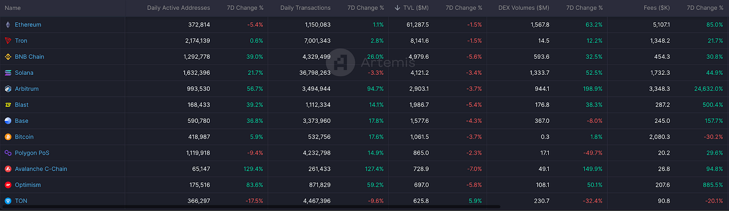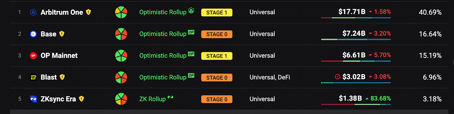 目前市場的焦點集中在 6 月 26 日發幣的 Blast,目前是 TVL 全體第四之 Layer 2 , Blast 算上 token 之後的 TVL 有望與第三名的 Optimism 比拼,至於市場會不會繼續砸盤 Blast 就只能拭目以待了。