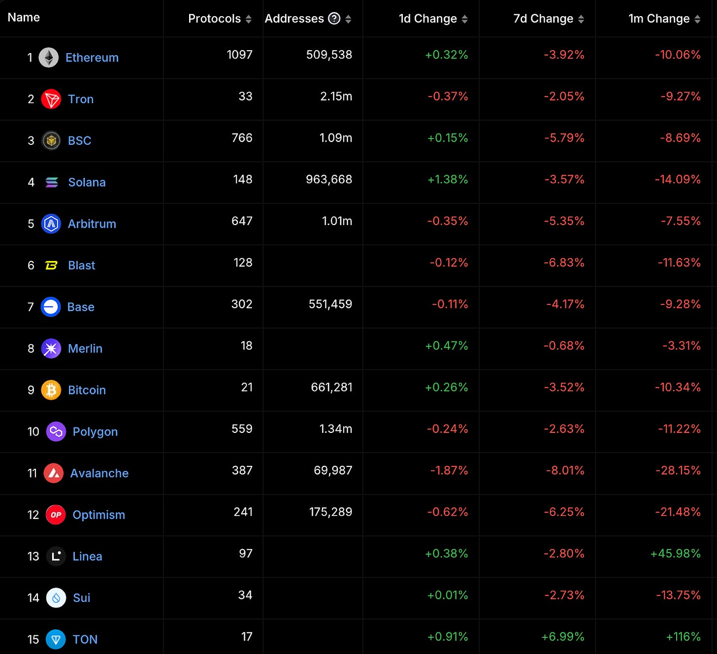 本週十大公鏈 TVL 都有所下滑,而以太坊生態系、Solana 均下跌。