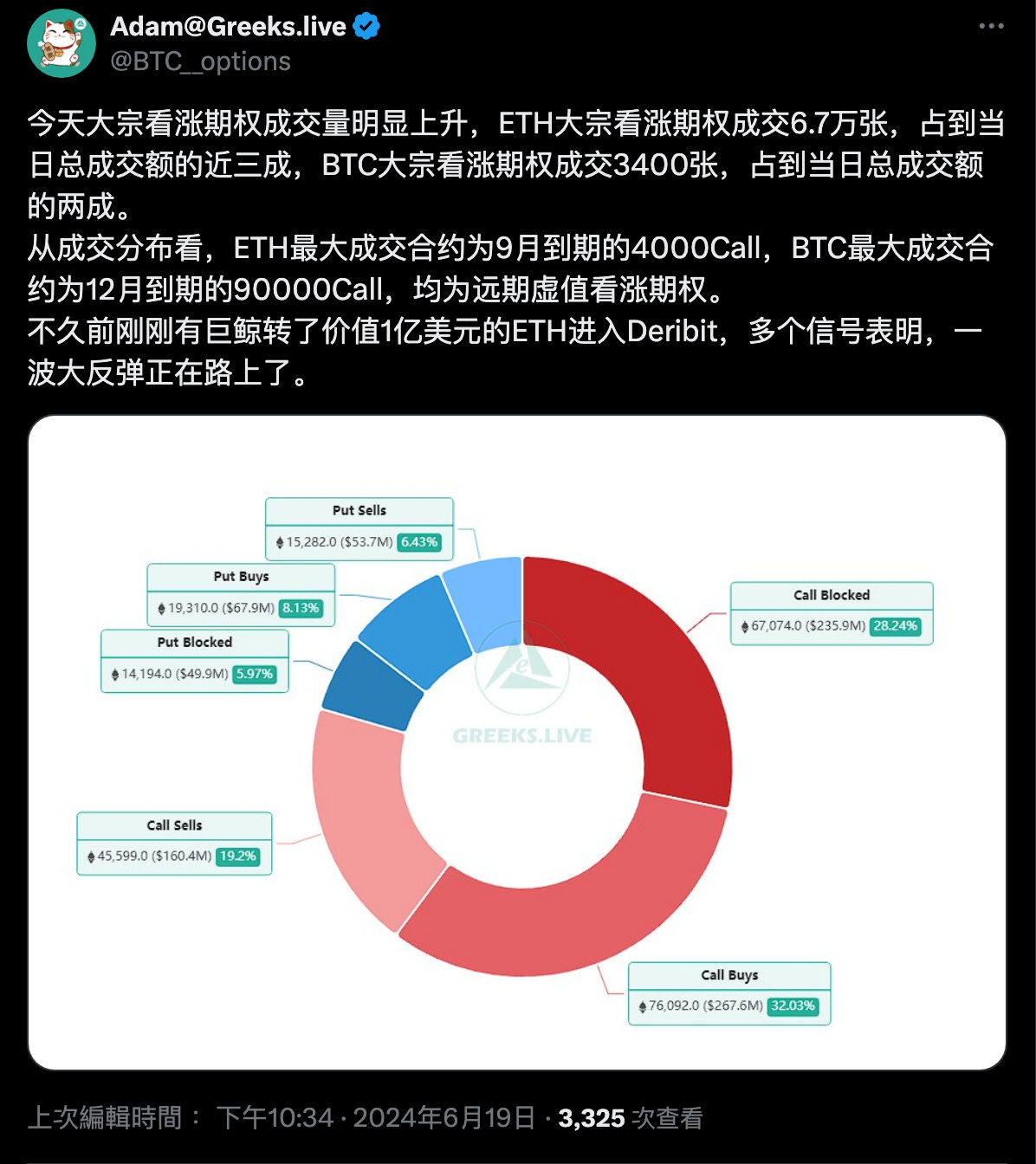 此外 Adam 也指出,過去一週期權市場出現了許多大宗交易,整體來看傾向鎖定 9 月底 ETH、12 月底 BTC,諸多訊號顯示大戶樂觀看待遠期的走勢。