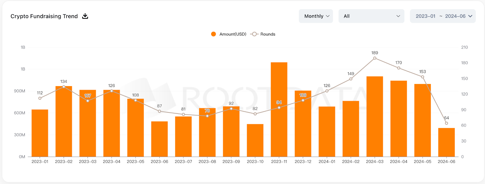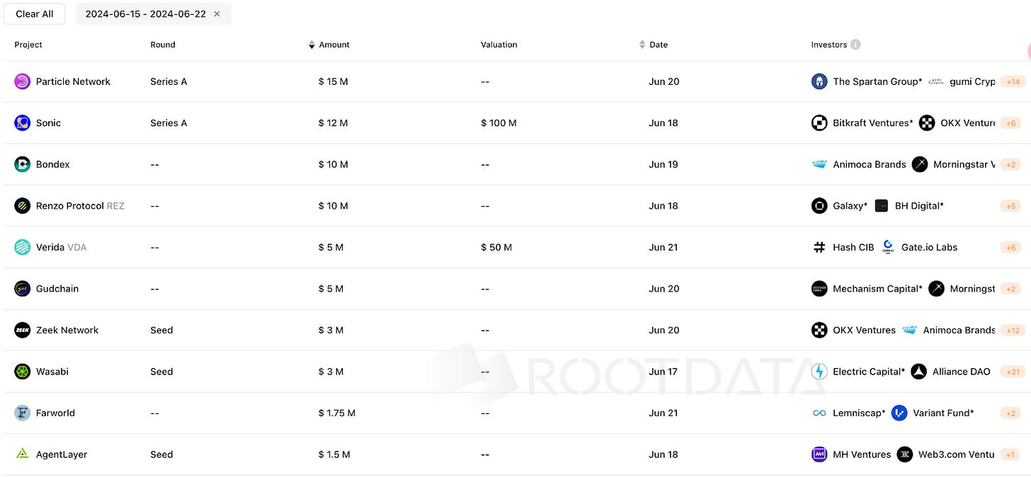根據 Rootdata,6 月的 Crypto 項目融資額累積僅約 5.3 億美元;融資案 64 筆,達到一年以來的低點,五月二級市場開始檢討「低流通,高 FDV」項目,興起「互不接盤,退出流動性」運動,致使許多熬到空投的項目發幣即巔峰,出現 FDV 倒掛的現象,事態發酵至六月可能使得一級市場融資不願意在此時披露。其次因為 FED 尚未降息、資金成本高、一級市場聚焦於 AI 產業等因素,使得 Crypto 融資更加不易。