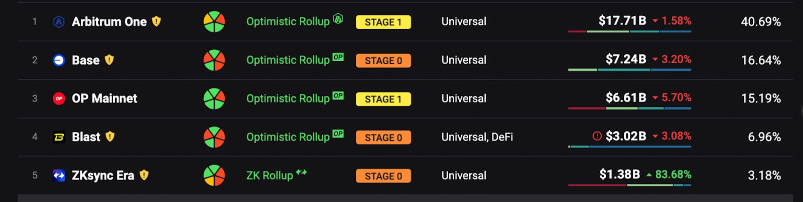 儘管 zkSync 的 TVL 顯示 14 億美金暫居第五名的位子且有著 80% 的增長,但細看我們不難發現當中有一半的 TVL 都是來自 $ZK 的市值,也就是說排除在外後,zkSync 在 Layer 2 只能排名 10.11 名,與 Manta、Mode 等 Layer 2 並列,四大 Layer 2 的野望如今只剩兩條(arbitrum、optimism)還在舞台的鎂光燈之下