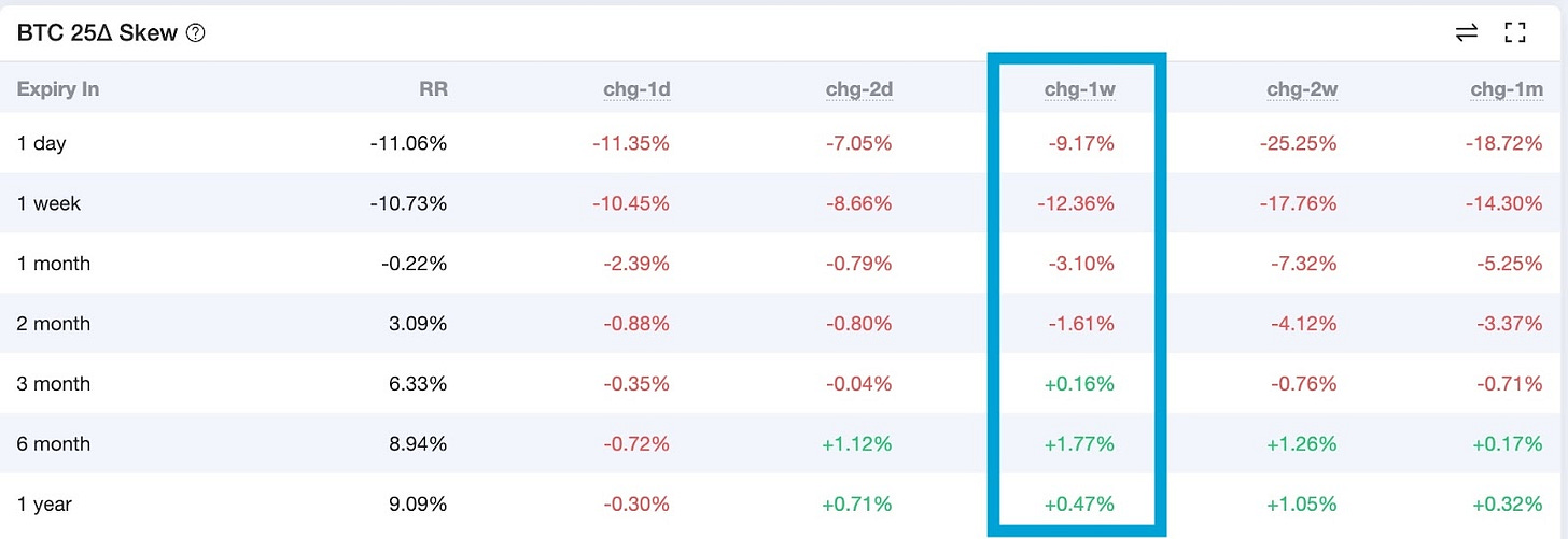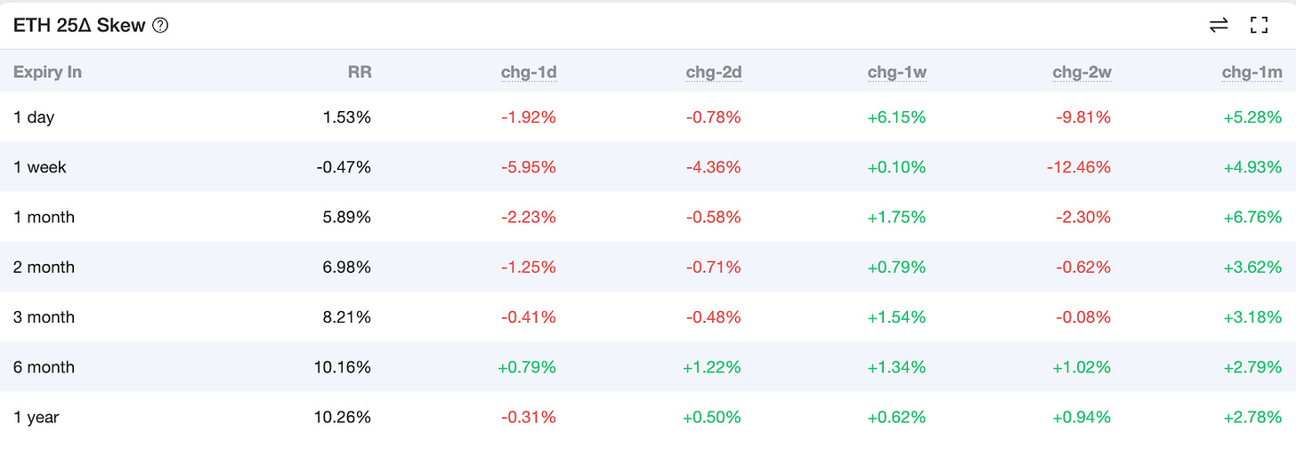 BTC 期權市場加劇了上週末以來的短空情緒,從單週變動中可以看到 2 個月內逐漸轉向悲觀;3個月以上到期的期權變得更加樂觀,目前市場預期顯著的降息將在 2024 年第四季開始啟動,許多 BTC 大宗交易都鎖定年底上漲。屯幣黨可以考慮在 BTC Layer 2、Pell Network、Karak、Bouncebit 等項目找尋 BTC 本位收益。