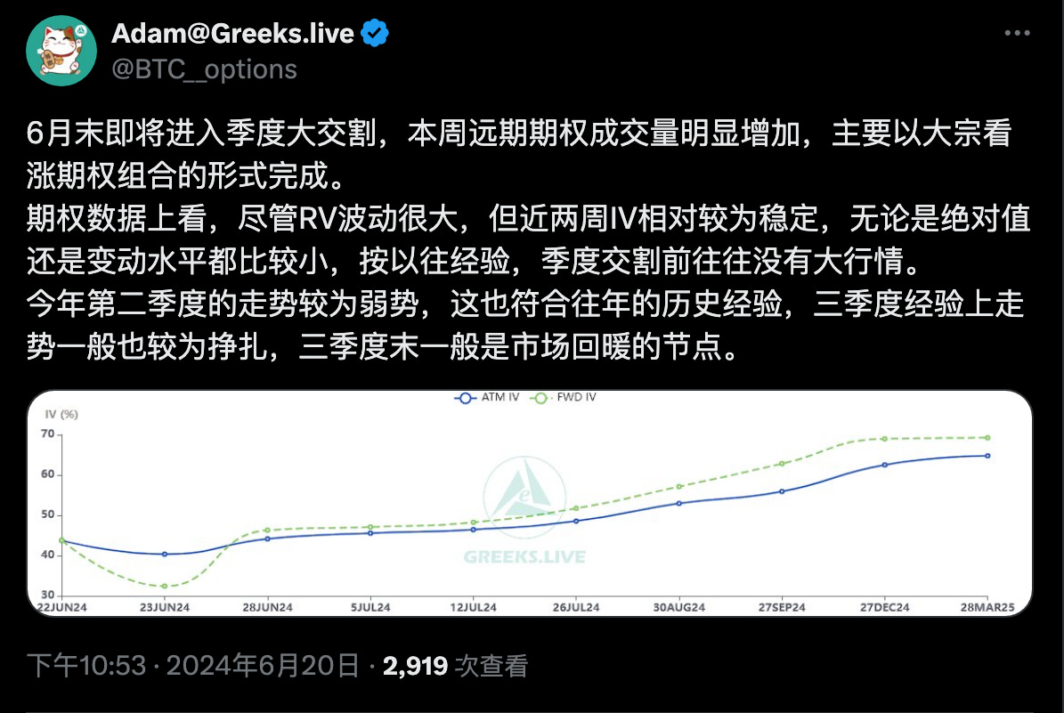Greeks.live 宏觀研究員 Adam 指出,儘管近期現貨價格波動大,但期權市場對於未來的價格走勢是穩定且一致的,可以樂觀看待第三季末以及第四季的行情。