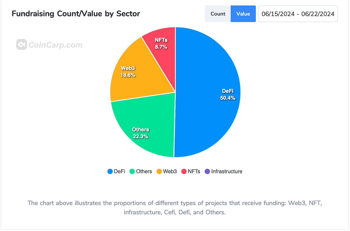 根據 CoinCarp 本週融資總額 5,376 萬美金,占比及排名分別為:
