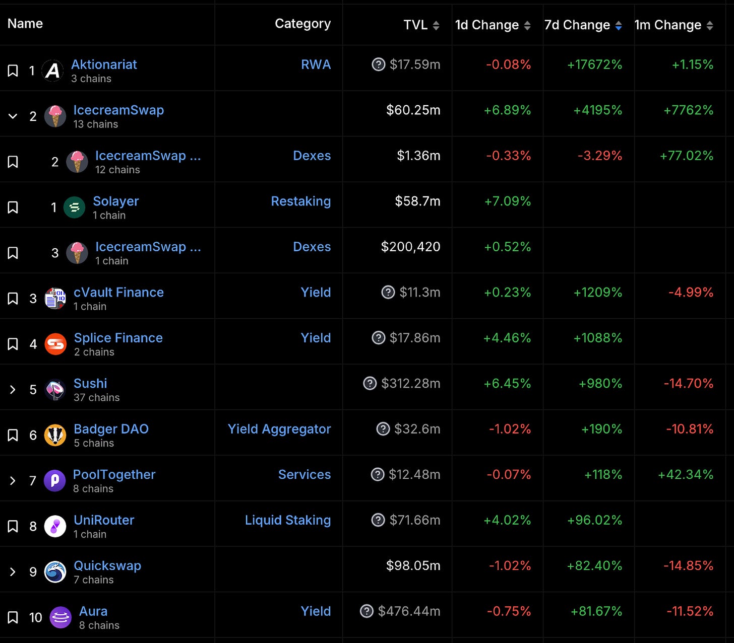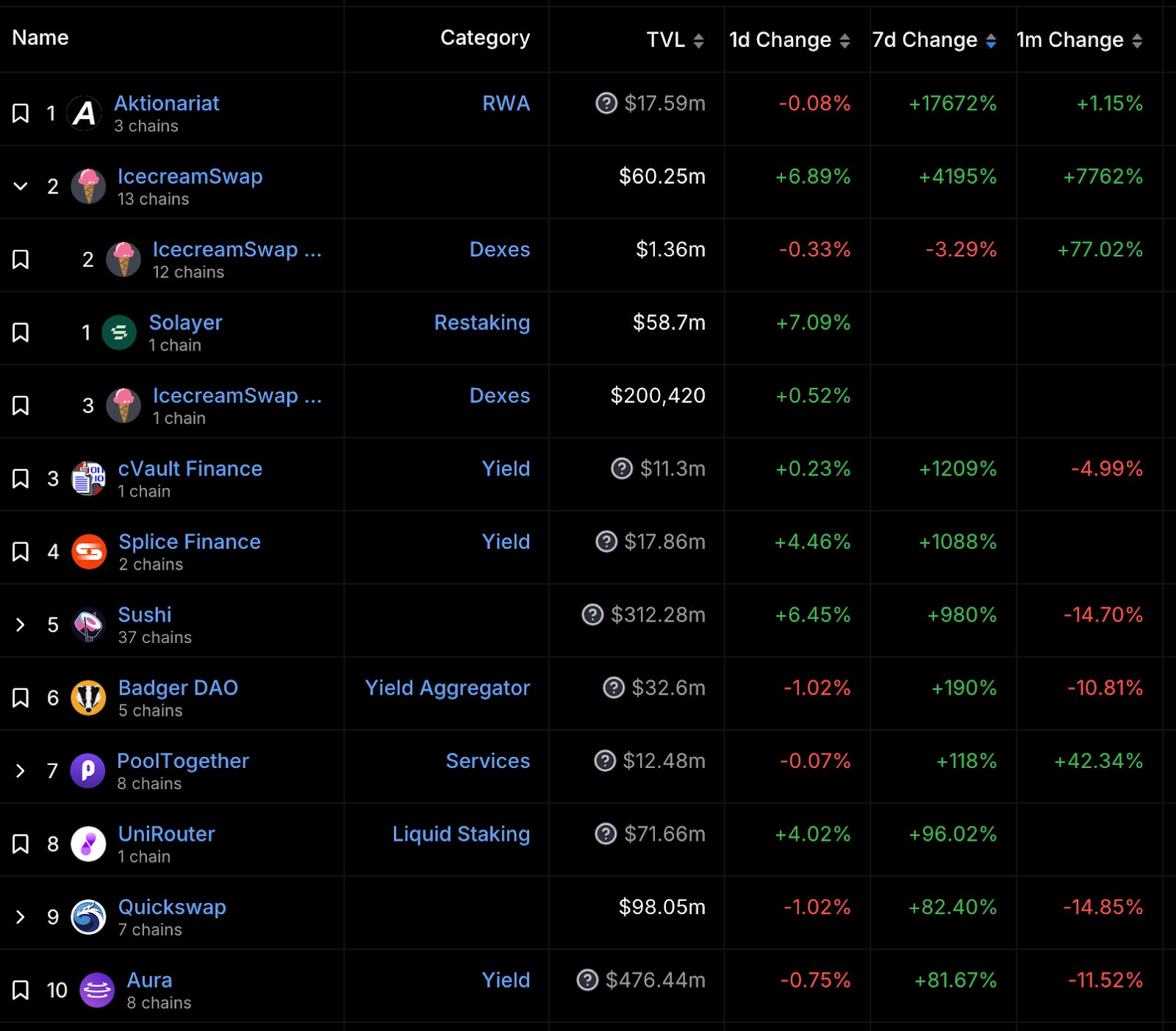(6,025 萬美金,4,195%)本身是橫跨 13 條公鏈的 Uniswap 分叉協議,上漲原因為 DeFiLlama Bug。6/21 當天 DeFiLlama 開始追蹤 Solana 生態的再質押項目 Solayer,因不明原因錯放進 IcecreamSwap 的分類,使其 TVL 瞬間從約 140 萬美金上漲至 6,025 萬美金,經查 Solayer、IcecreamSwap 無從屬關係。