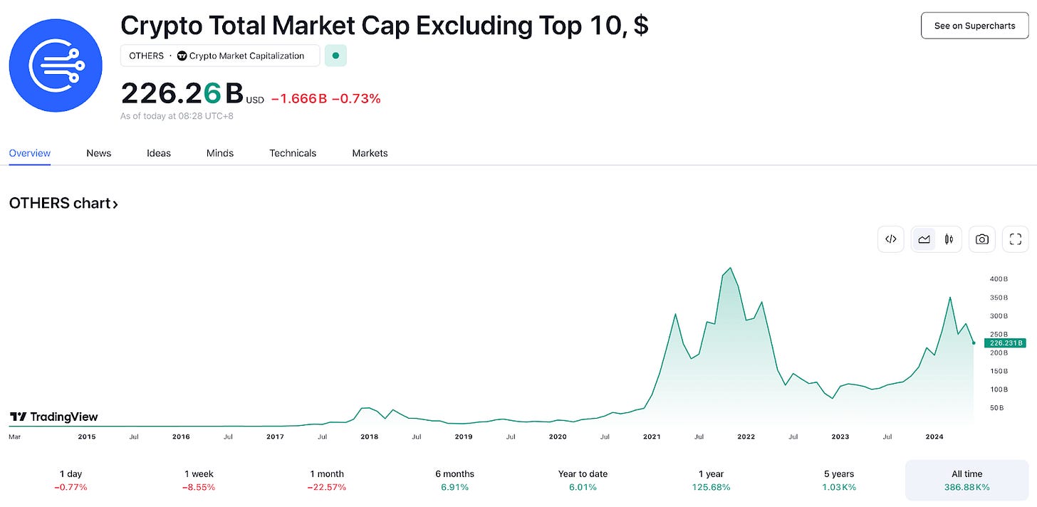 OTHERS 前十大幣種以外的加密資產市值,可以更顯著的呈現目前山寨幣的行情。