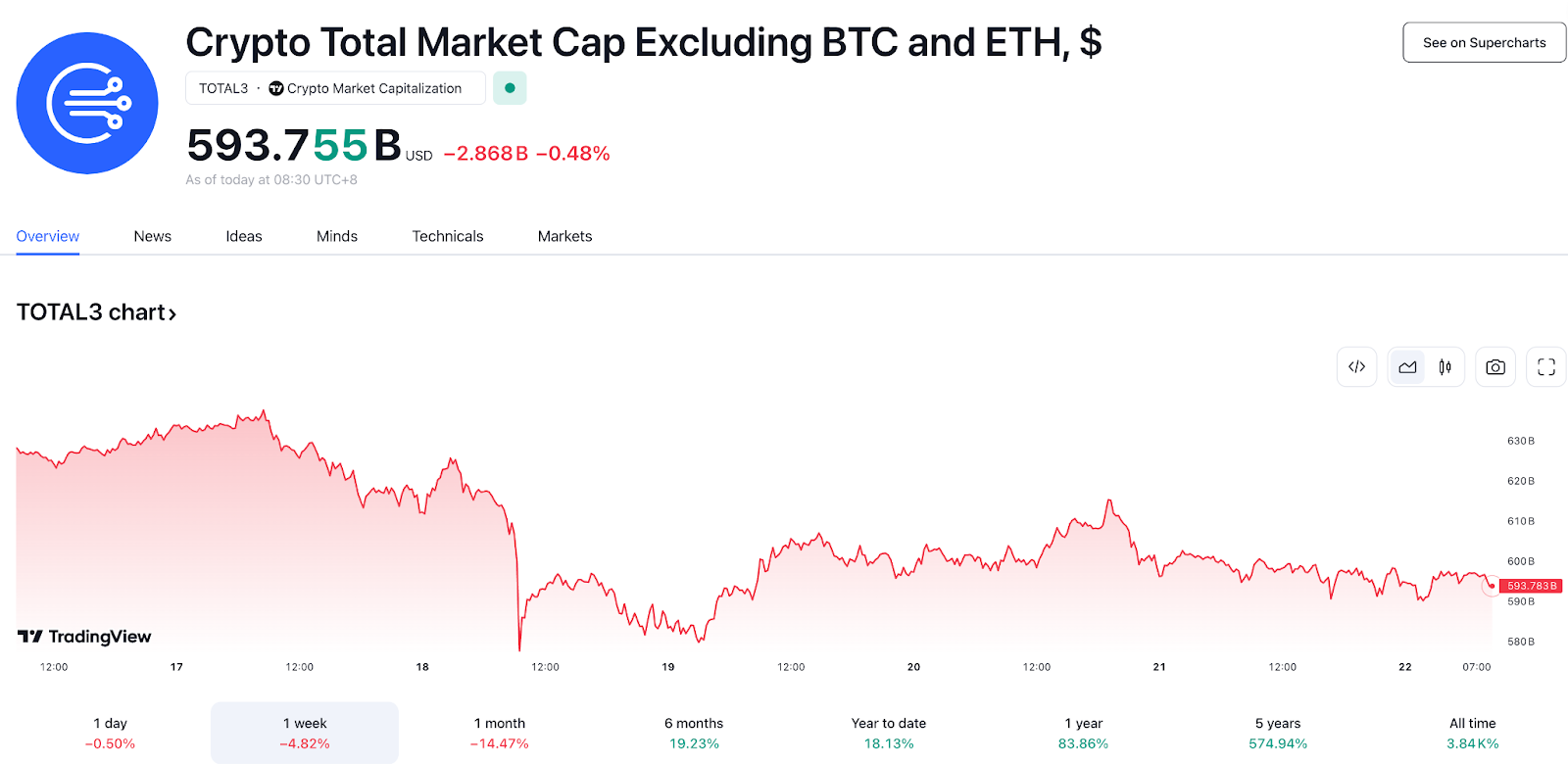 過去一週 TOTAL3 持續下跌了 4.82%,一個月已累積蒸發 15% 市值。