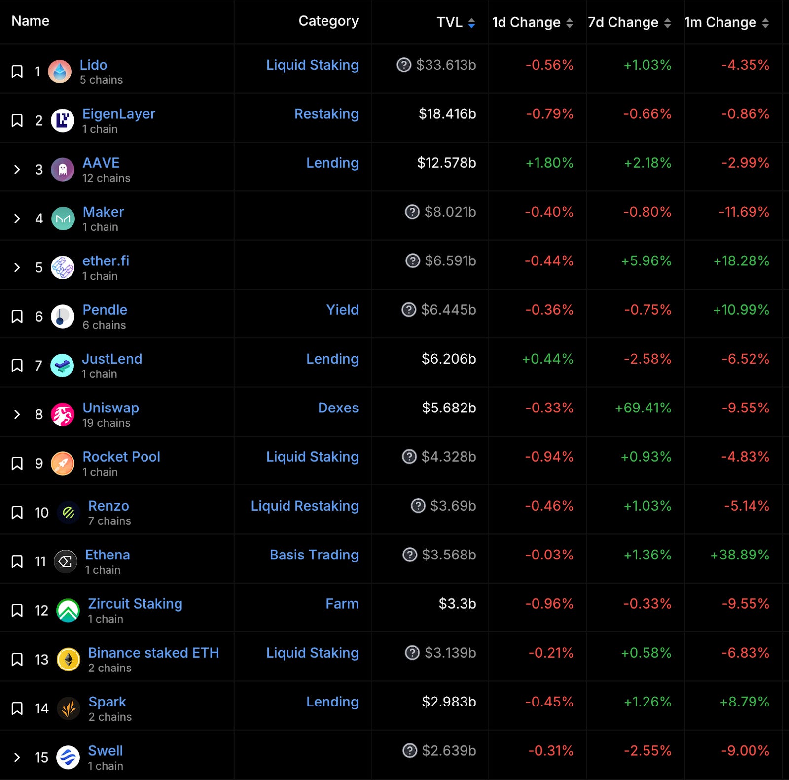 註:Uniswap 上漲 69.41% 為統計錯誤,本週 Uniswap TVL 無顯著變化。