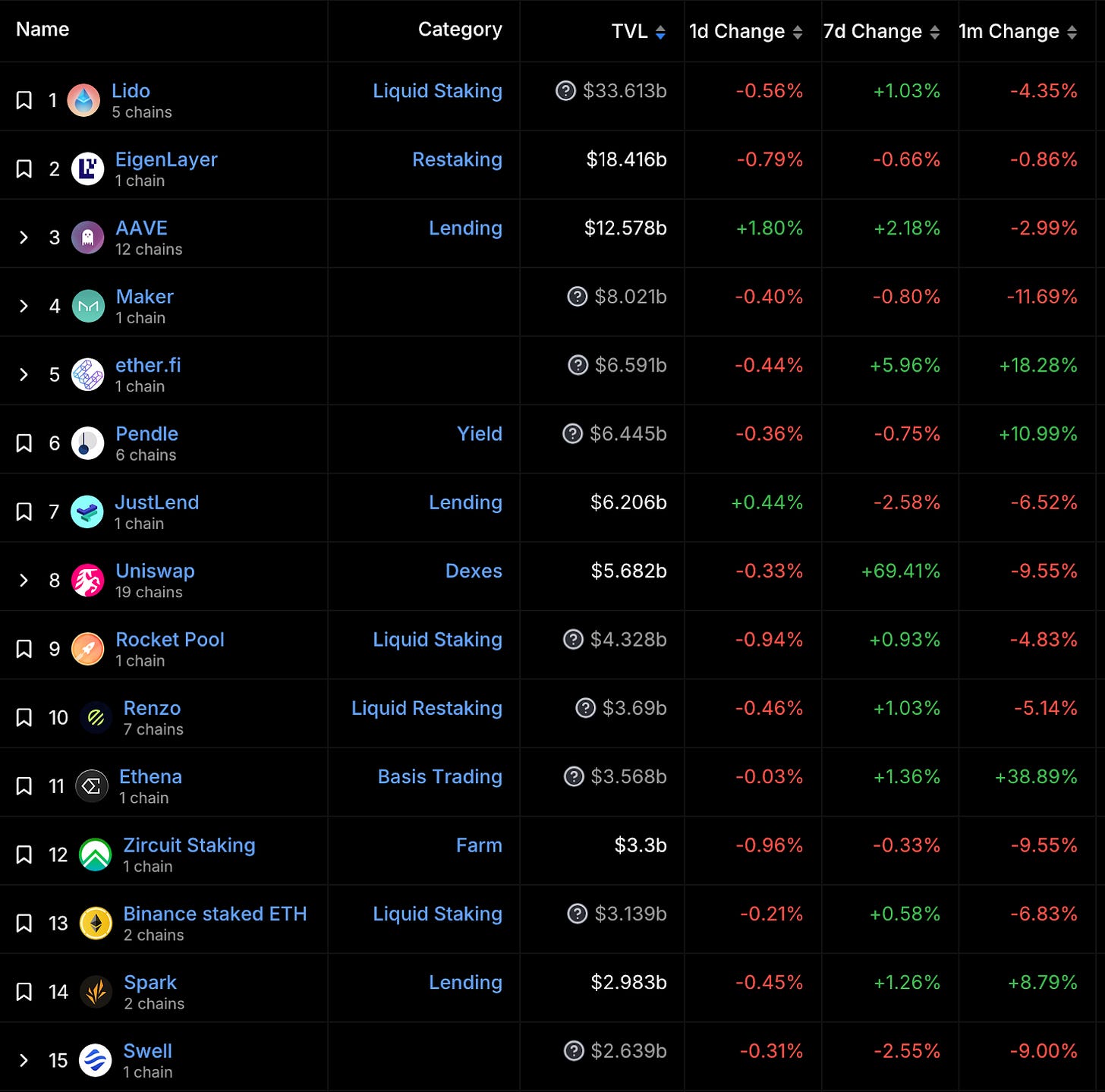 本週因為 ETH 幣價持平,前十名 TVL 有 -1-3% 的變化。
