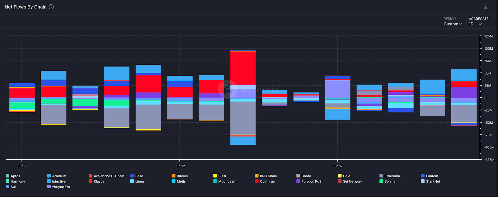 zksync 最近兩週的流量波動較大,整體而言淨流入不高,在空投過後持續流出。