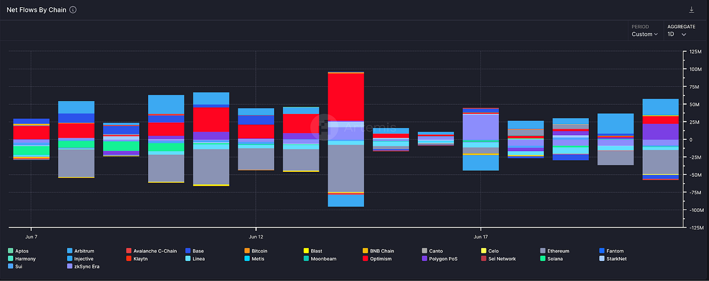 近一週持續有新的資金從以太坊主網流向 Optimism、Arbitrum、Base,回歸到先前的常態。
