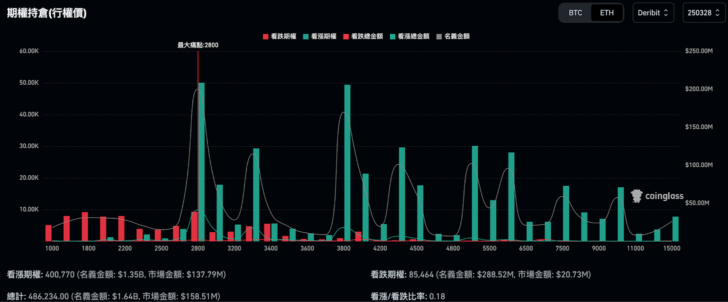 觀察 2025 年 Q1 的 Deribit 期權持倉狀況,市場普遍仍看漲後市。值得關注的是目前位於 2800 的最大痛點,由於最大痛點的牽制效應較容易發生在即將到期,且市場持倉量極大的期權,不必擔心 ETH 會因此下調至 2800。