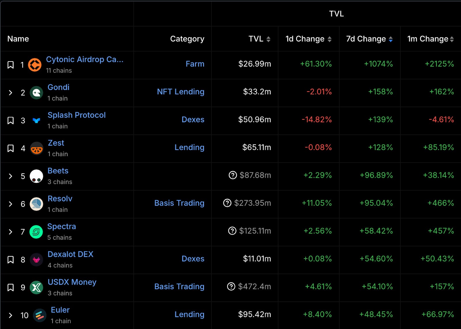 Cytonic Airdrop Campaign(2,699 萬美元,10.7 倍)是 MultiVM 協議,近期與 SVM 項目 Soon 達成戰略合作,11 月以來開啟預存活動,本週有大量 Manta 生態的 $MUSD 存入,成為 TVL 暴漲原因。