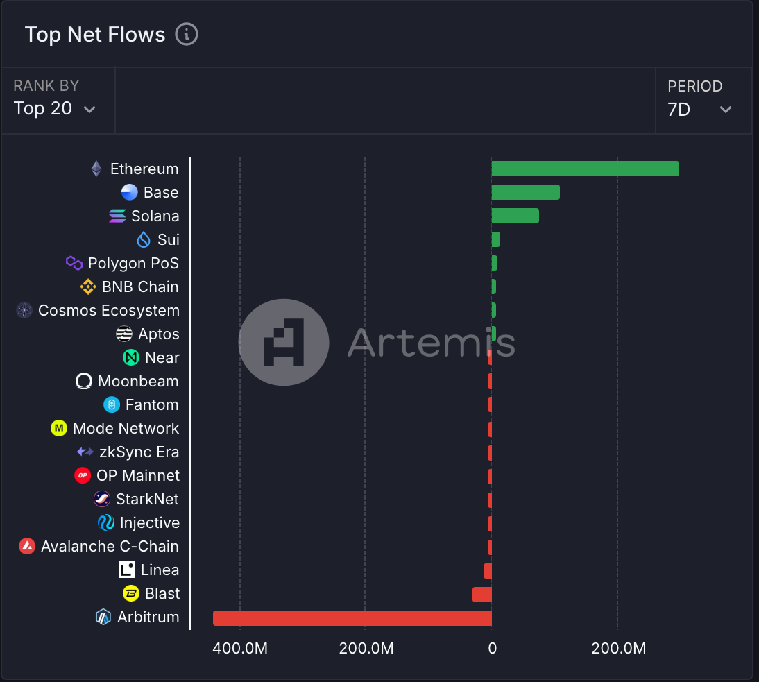 Ethereum +2.98 億:繼上週出現 Arbitrum 資金微幅流出 100 萬美金,本週 Arbitrum 大幅淨流出 4.41 億至以太坊主網,導致連續數週都大幅淨流出的 Ethereum,本週出現淨流入的現象。對照前幾週 Arbitrum 數據呈現出 Hyperliquid 熱潮,短期來看熱錢已退去,然而 HyperEVM 仍在非常早期的階段,值得持續佈局 HyperEVM 生態及其重點項目