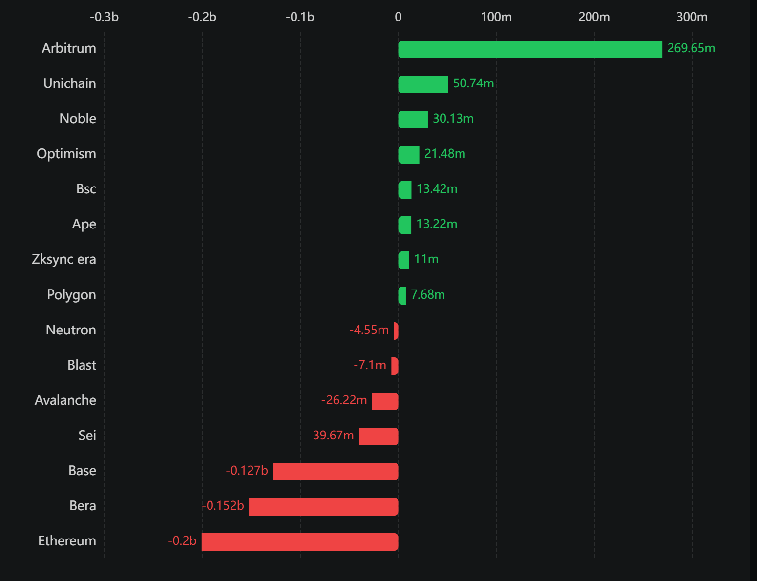 近兩週,Unichain 因持續受到激勵計畫的推動,跨鏈淨流入激增。本周,該平台的擔保金額已超過 4.64 億美元,成為 TVS 排名第五的 L2。自上周錄得 TVL 漲幅 25 倍以來,本周 TVL 仍持續攀升,目前已達 3.2 億美元,表現相當良好。後續有望突破 4 億美元大關,值得關注是否會有更多資金流入。Noble + 3,000 萬