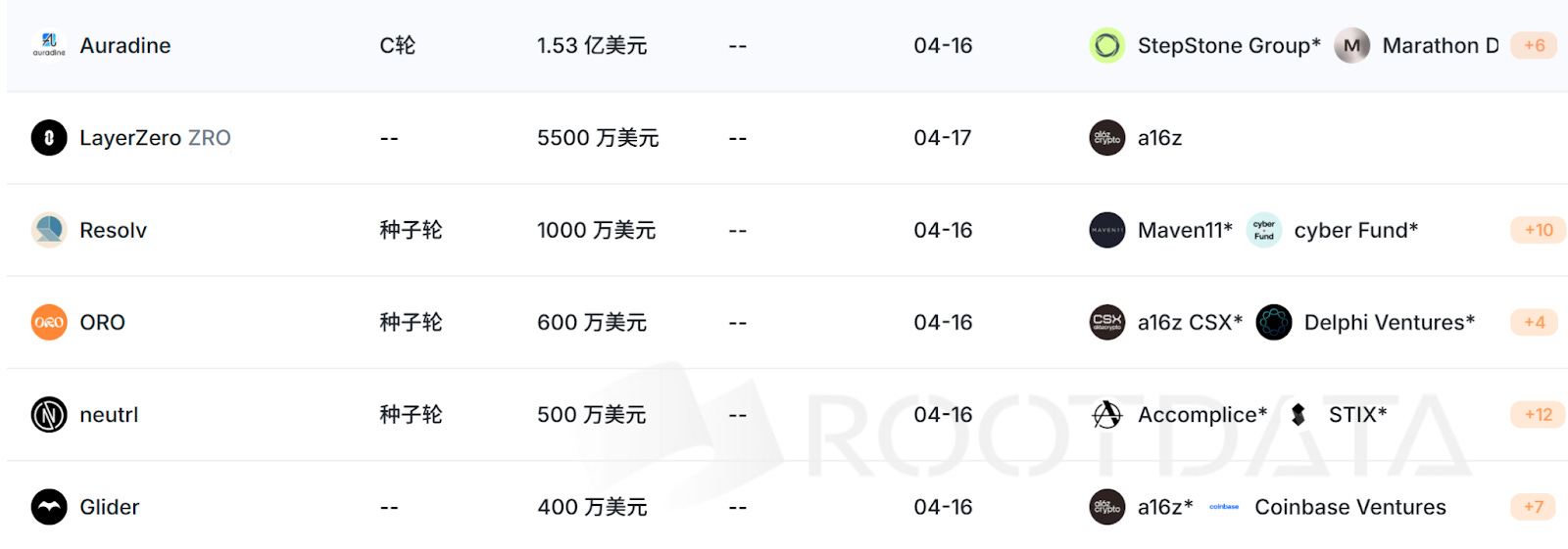ORO(1000 萬美元)是一個去中心化 AI 平台,完成 600 萬美元種子輪融資,由 a16z Crypto Startup Accelerator(CSX)與 Delphi Ventures 領投,NEAR Protocol、0G Labs 等參投。