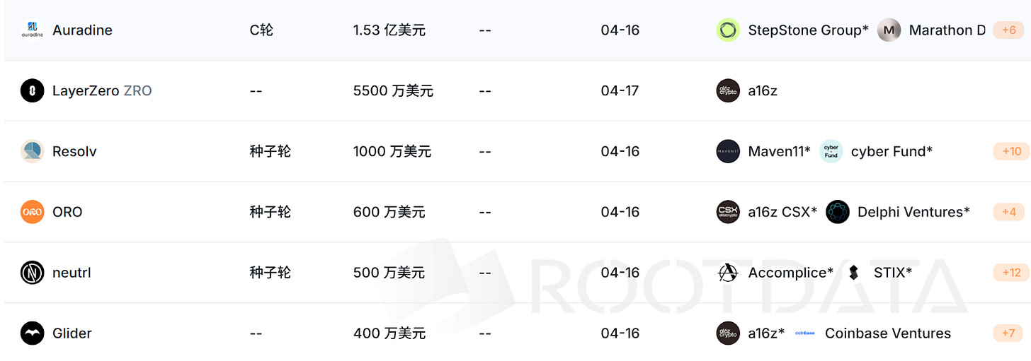 Resolv (1,000 萬美元 ) 為主打收益型穩定幣 USR 的 DeFi 協議,完成 1,000 萬美元種子輪融資,由 Cyber.Fund 和 Maven11 領投,Coinbase Ventures 等參投。協議 TVL 為 4.5 億美元。