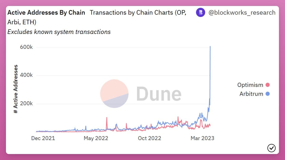 到目前為止,Arbitrum 擁有 61.1萬個地址,打破了 Optimism 之前 5.3萬個地址的記錄。