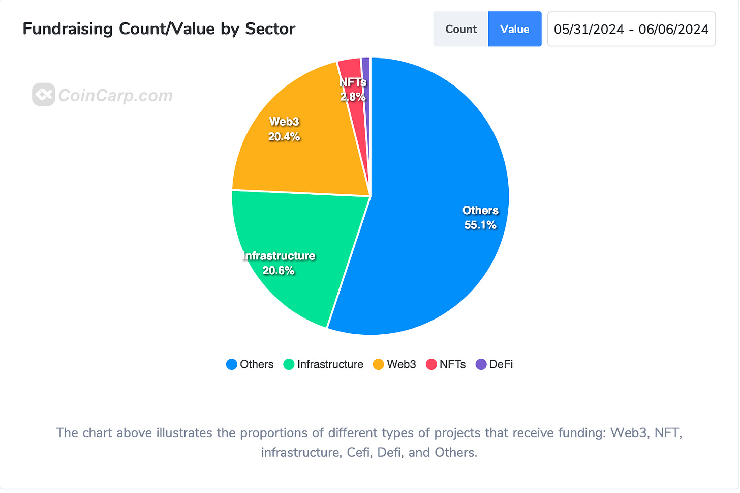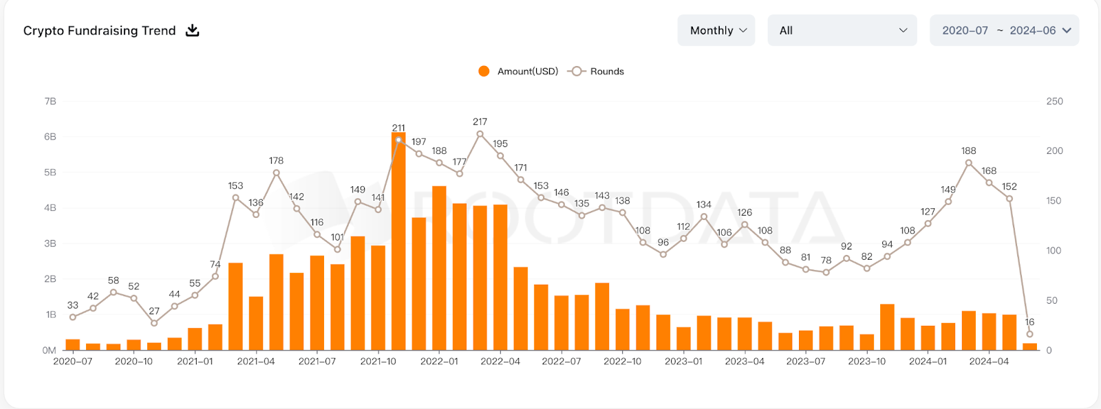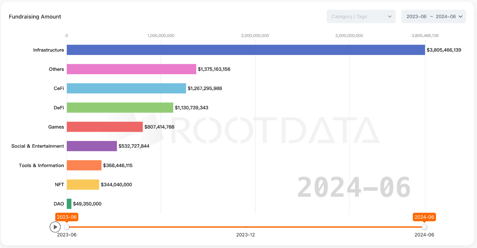 過去一年融資主要聚焦於基礎設施,其中大部分項目和 RaaS、再質押、LRTs、鏈抽象、BTC Layer 2 有關。第二名 Other 類別中大多是 AI 項目。