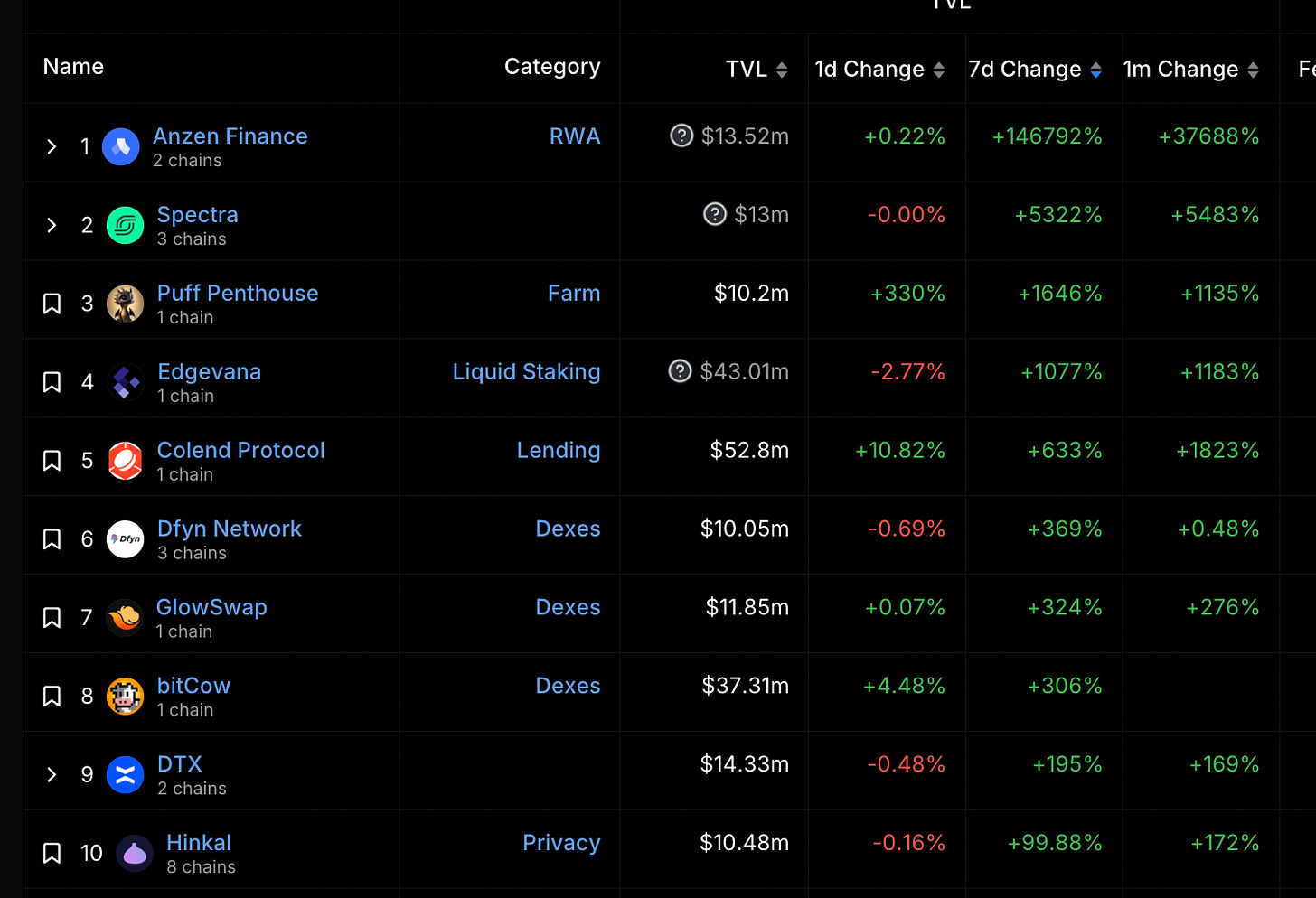 漲幅最大項目(TVL 大於 10M)