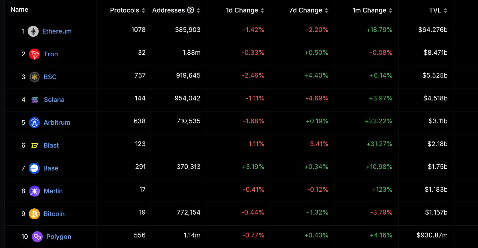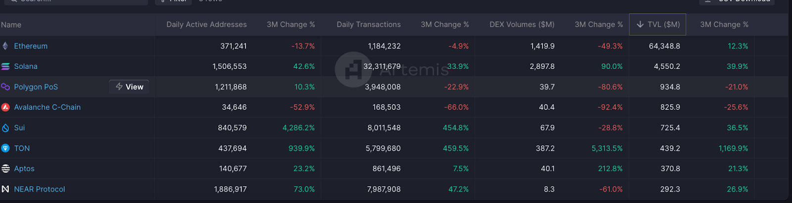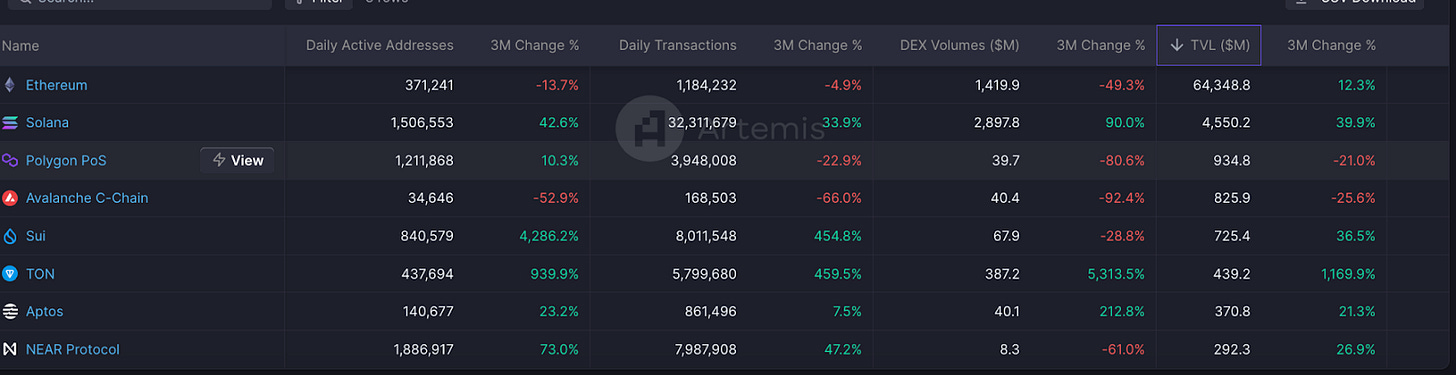 可看到 TVL 前幾名公鏈如 Avalanche、Polygon 近三個月的交易量大幅下降,TON 則大量增長,排名有望持續前進