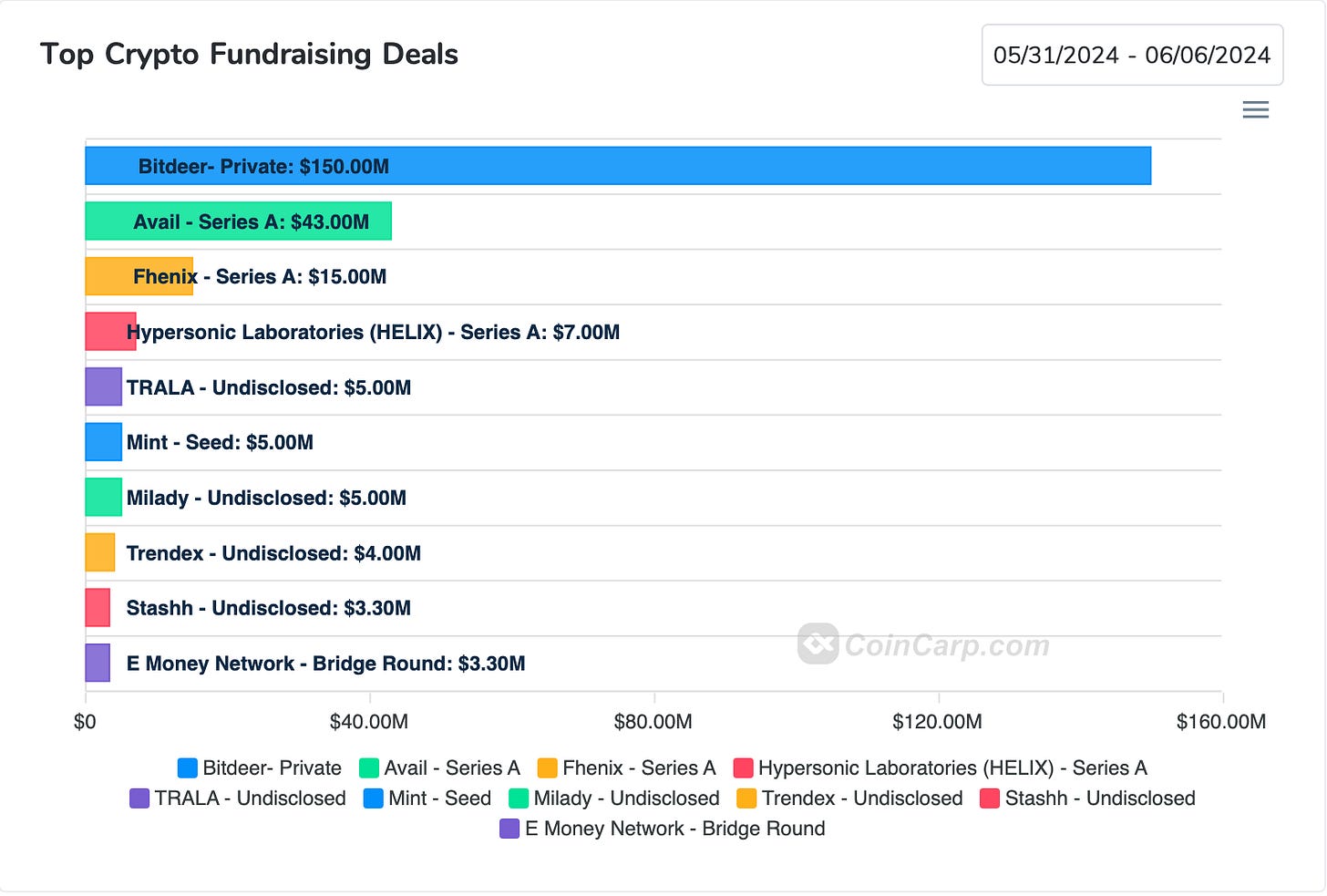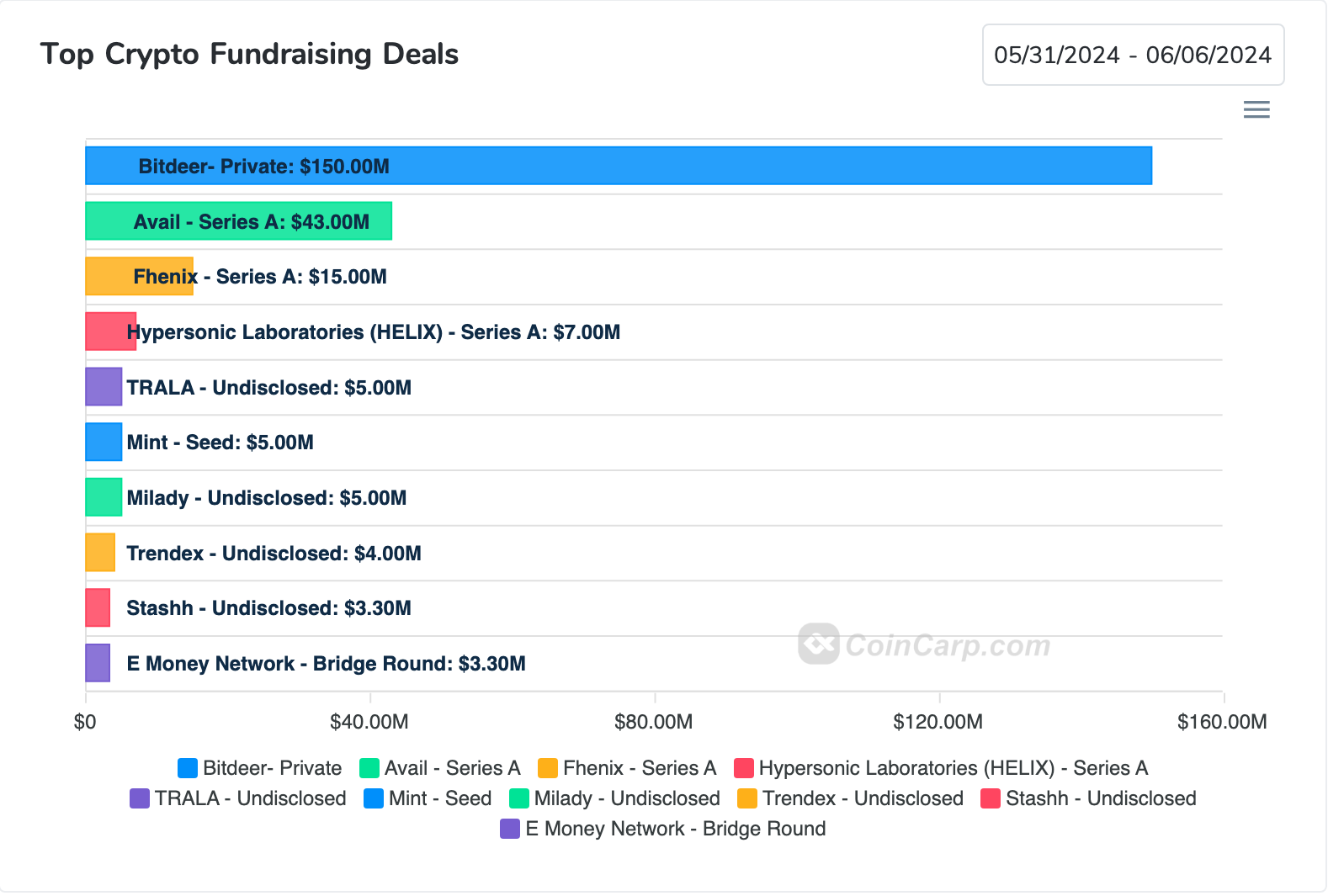 本週龍頭融資龍頭是美國資產交易平台 Robinhood 對第 10 大中心化交易所 Bitstamp 的併購案(2 億美金),目前此案尚須經過監管機關核可,完成後 Robinhood 將有望成為淨資產第三大交易所,僅次於 Binance 和 OKX,並有效進入歐洲與亞洲市場。
