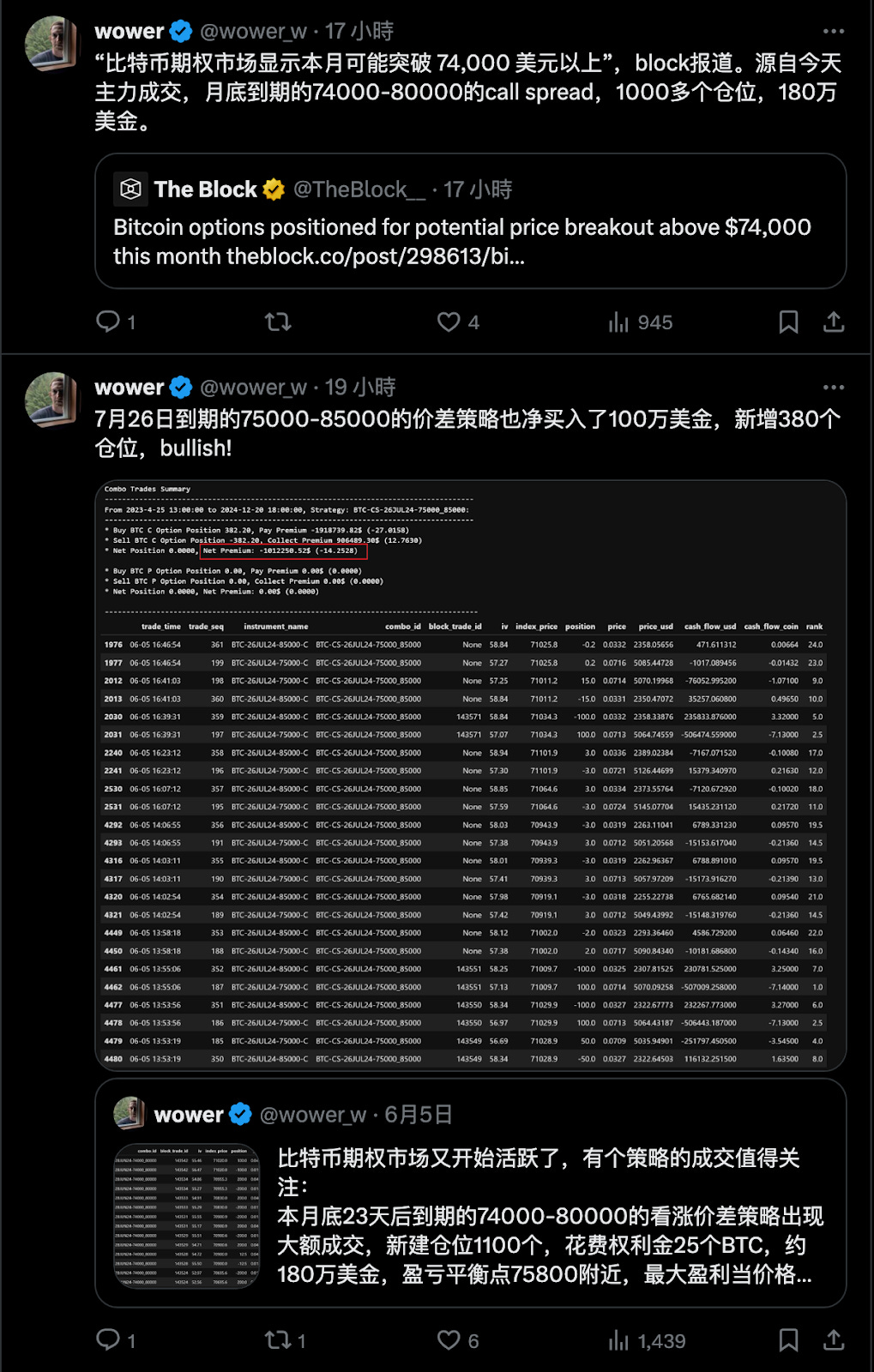 期權分析師 wower 在本週 BTC 上漲前兩小時提到,市場中的幾筆大宗交易看漲期權有超過 1300 萬美金的淨買入,過去有如此大額的交易都非常 Bullish,在 6/6 拉盤後 wower 提到分別有數百萬的資金正在鎖定 BTC 在月底前 ATH 突破 74000 美金。
