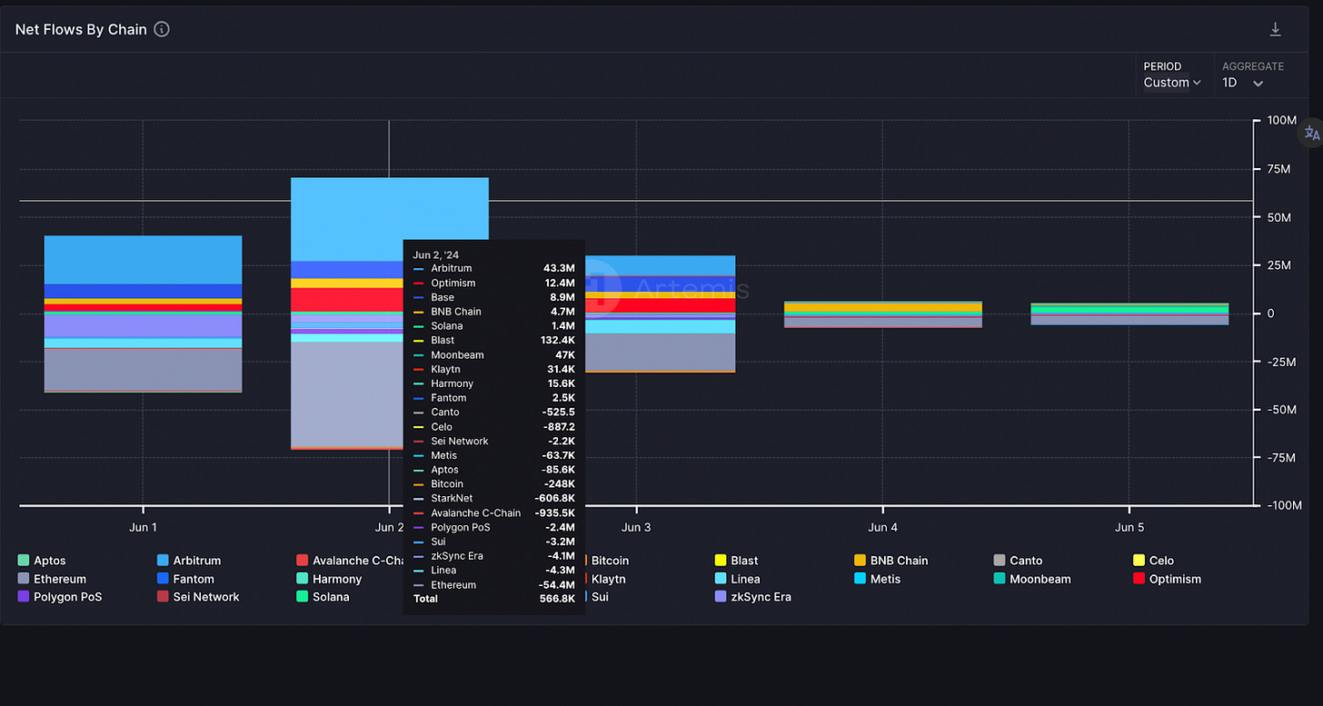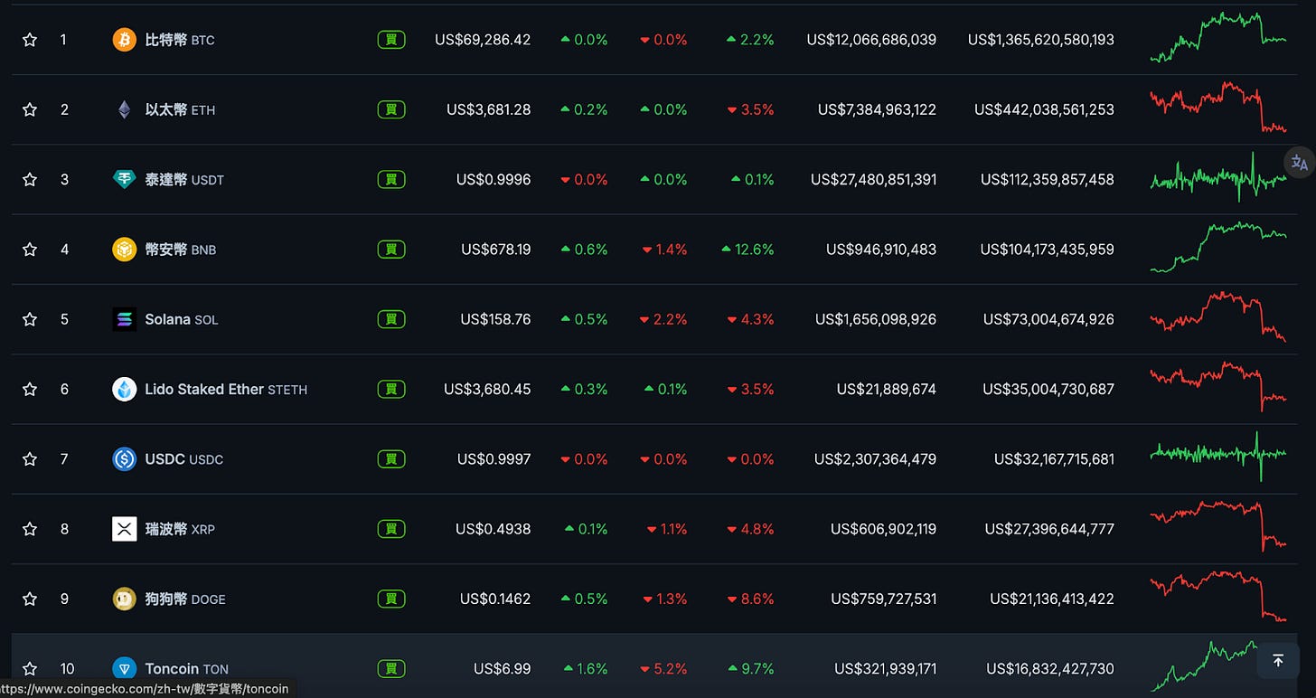 本週 TON BNB 雙雙漲超 10%,領漲前十大幣種,前者近期先在 OKX Jumpstart 上線生態最大迷因幣 $NOT,而後在本週從底部拉盤超過 5 倍,市值達 21.4 億美金,也帶動 $FISH 從底部拉了 3 倍,迷因帶動整個生態發展,可持續關注,尤其是結合 Telegram 功能的遊戲,如起初的 $FISH 以及最近的 Hamster Kombat、FOMO TAP、Catizen。