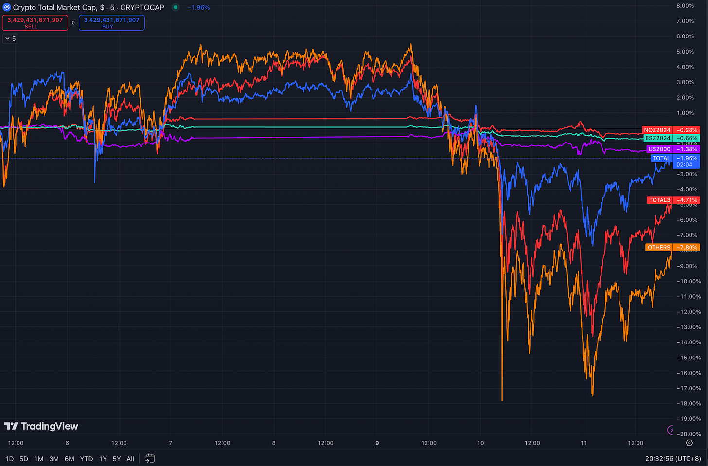 大盤在快速膨脹一個月之後經歷第一次重大回調,OTHERS 不到 24 小時從頂點最高蒸發 20% 市值,並持續在底部震盪約一天,今日大盤正持續回血。在這一波下殺中可以看見加密大盤的風險和回調速度,回血期間值得回測這段期間韌性較強的標的,檢驗是否能成為下一個暴漲幣。