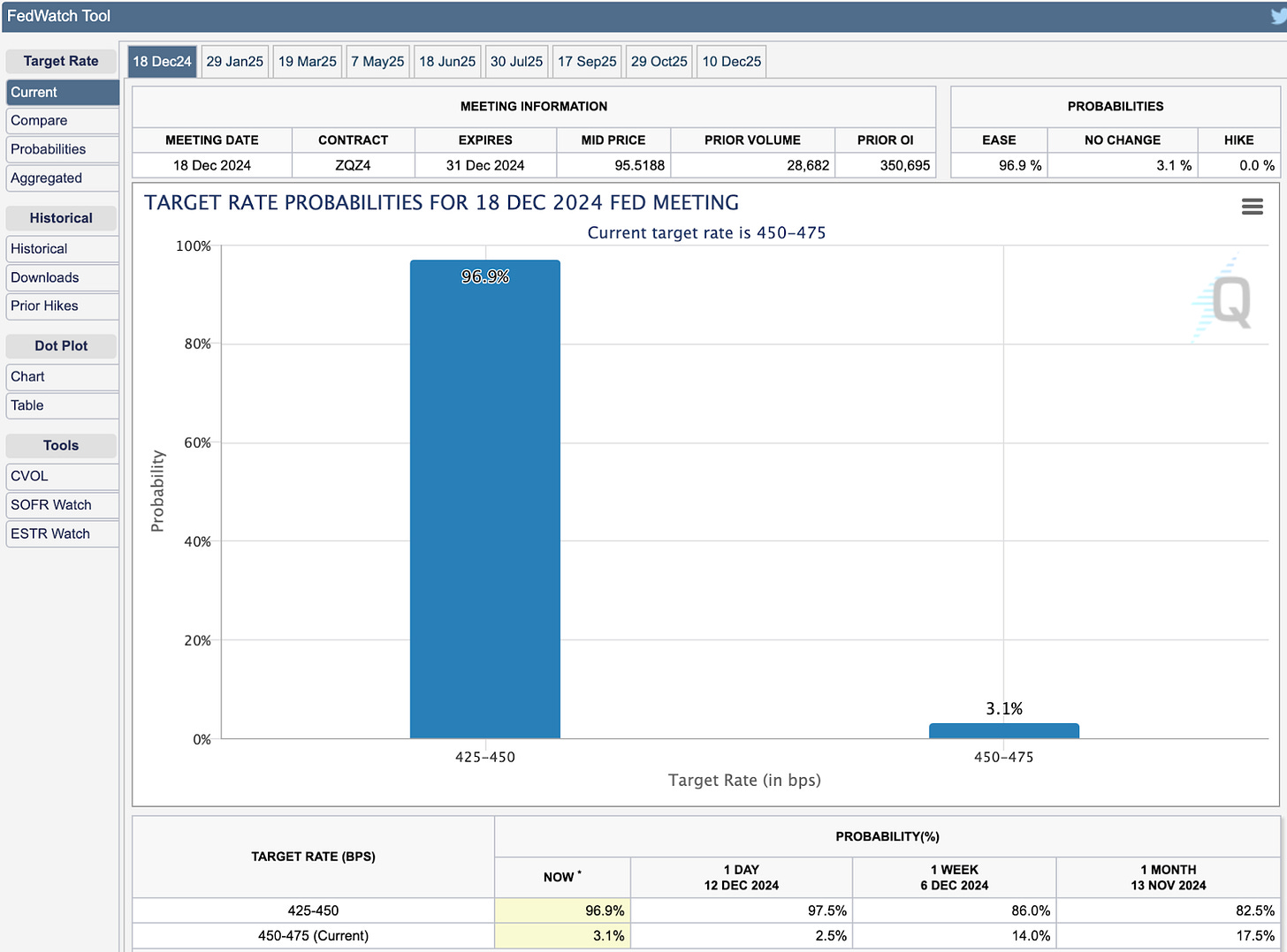 美國 11 月 CPI 2.7% 符合預期,數據發佈後 FedWatch 降息 1 碼機率上升至 96%,12 月 19 日利率會議前無其他重大經濟數據,預測不確定性低