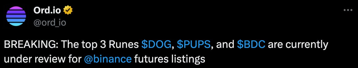 三大 Runes, $DOGS、 $PUPS 、 $BDC 已被提名上線 Binance 合約市場,若通過審核,將大幅改善目前 Bitcoin 難以自然價格發現的問題。
