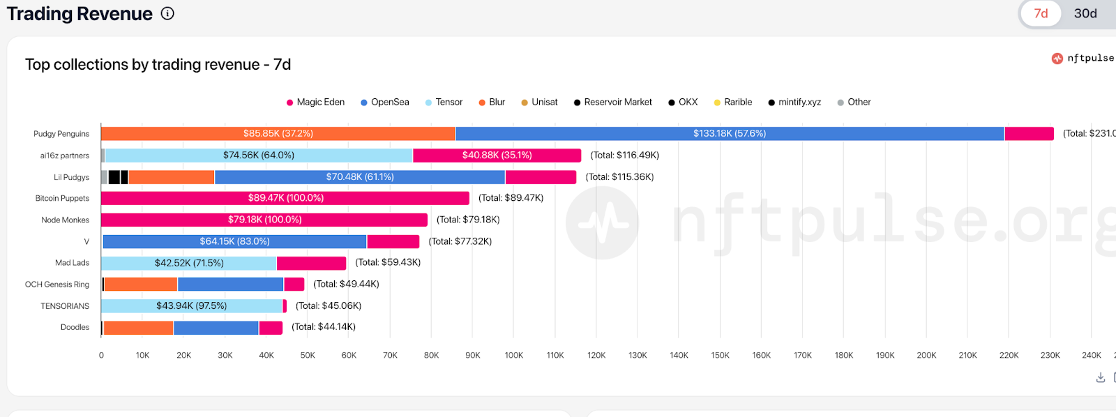 透過 NFT Pulse 的數據可以看到在回暖的 NFT 當中,也有比特幣 NFT 包含 Bitcoin Puppets、Node Monkes 等,當中交易量是被 Magic Eden 所包辦。