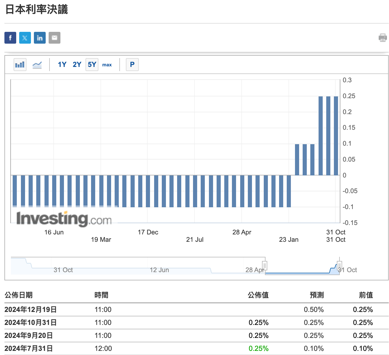 12 月 19 日 11:00(UTC +8 時區)日本央行即將宣布是否會升息,先前有數據指出大部分經濟學家此次將會升息,根據 Investing.com 數據,分析師預測將會升息 1 碼,繼今年 7 月之後再上調 25 個基點。