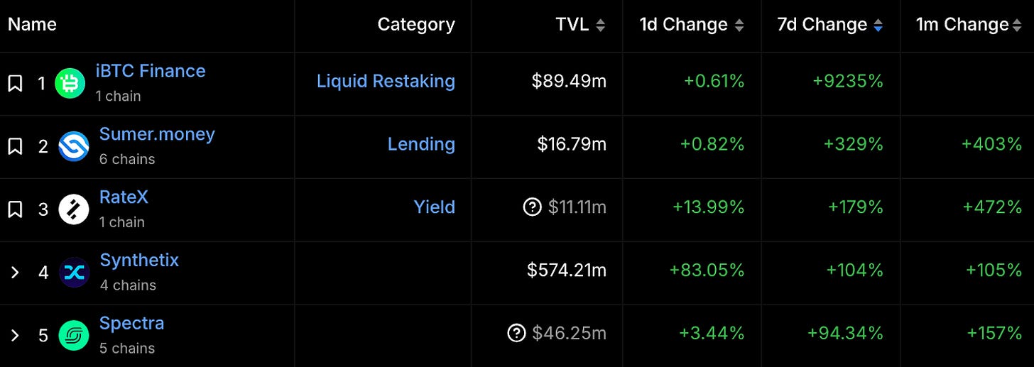 329%)是活躍於 zkLink Nova 生態的流動性質押收益項目,發行 $suUSD、$suETH、$suBTC ,本週流入 1,300 萬美金的 $solvBTC.M,目前非常活躍於 Berachain 生態,將在主網上線後發行 $suBERA,值得關注後續發展。