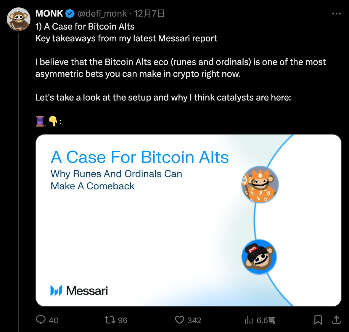 本文作者 Monk 是 Messari Crypto 的研究員,主要提到 Bitcoin Alts 生態,符文 Runes 和 銘文 Ordinals,目前是幣圈中盈虧比最高的投資機會之一,並指出近期 Bitcoin 山寨市場可能逐漸回暖,有望迎來復興。