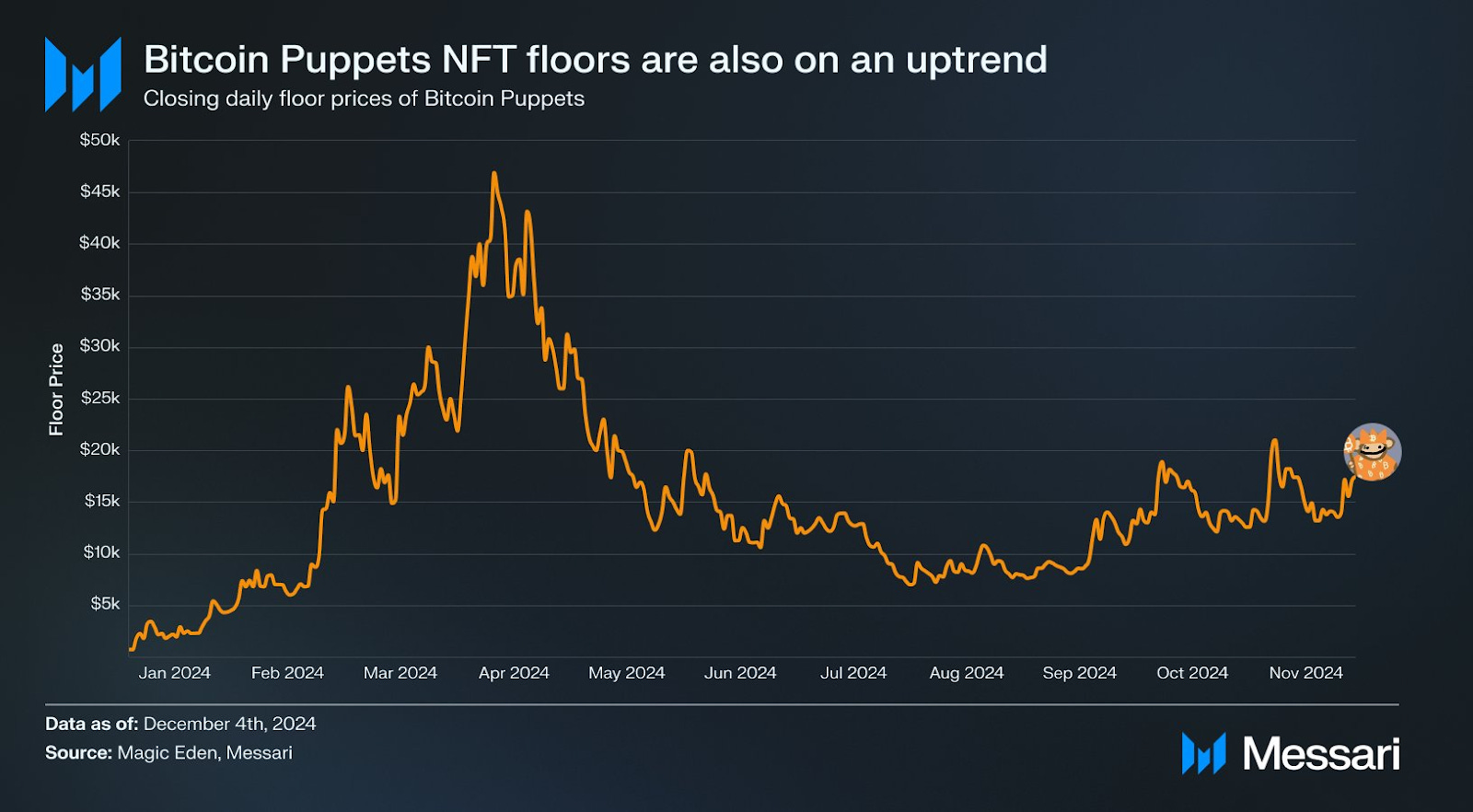 Ordinals 系列如 Bitcoin Puppets,在大多數週內穩居 NFT 頂級系列的前十,近期底價也出現明顯上升