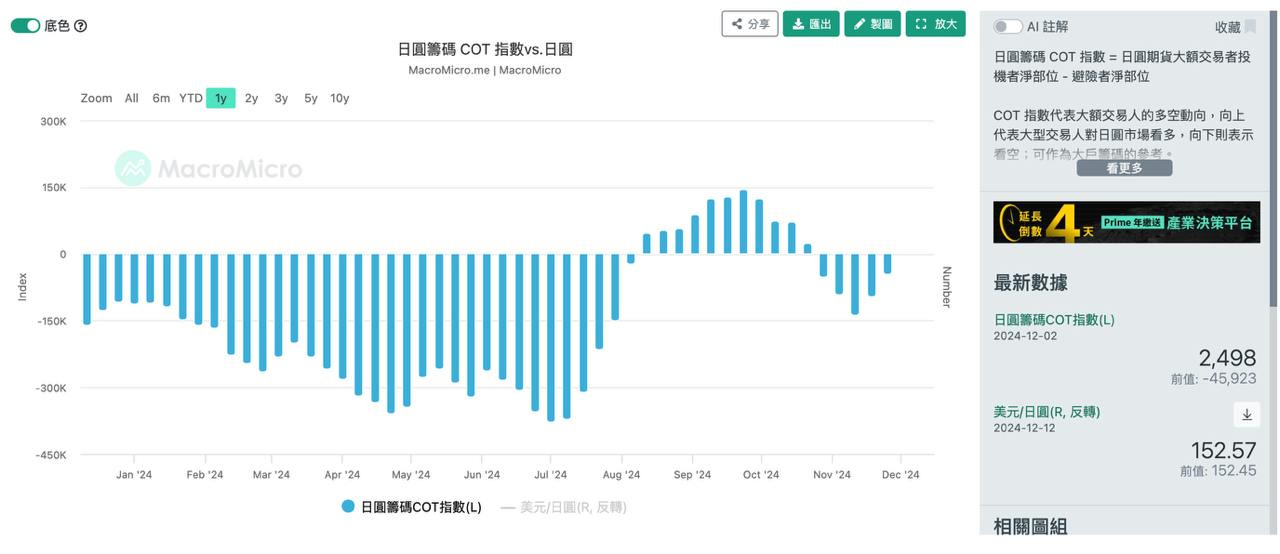 許多投資人可能認為此次升息將對市場帶來衝擊,然而我們可以透過日圓籌碼 COT 指數得到答案。圖中顯示該指數已從 11 月底的 -45,923 上升至 +2,498,代表市場中的套利交易頭寸大多已平倉或是已避險,由此可知此次升息帶來的影響將會遠小於 8 月 5 日的金融恐慌。