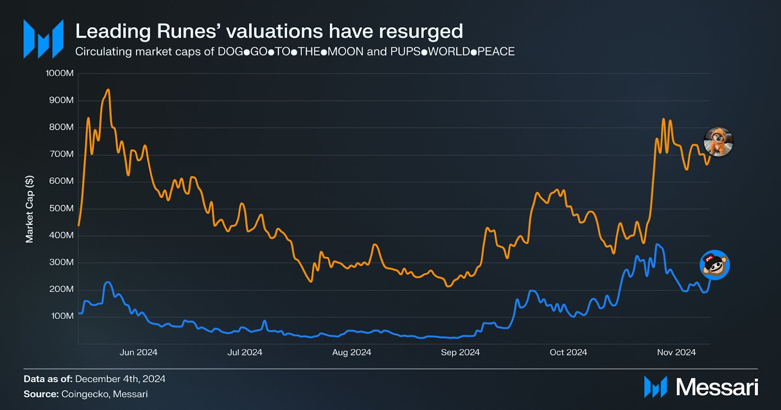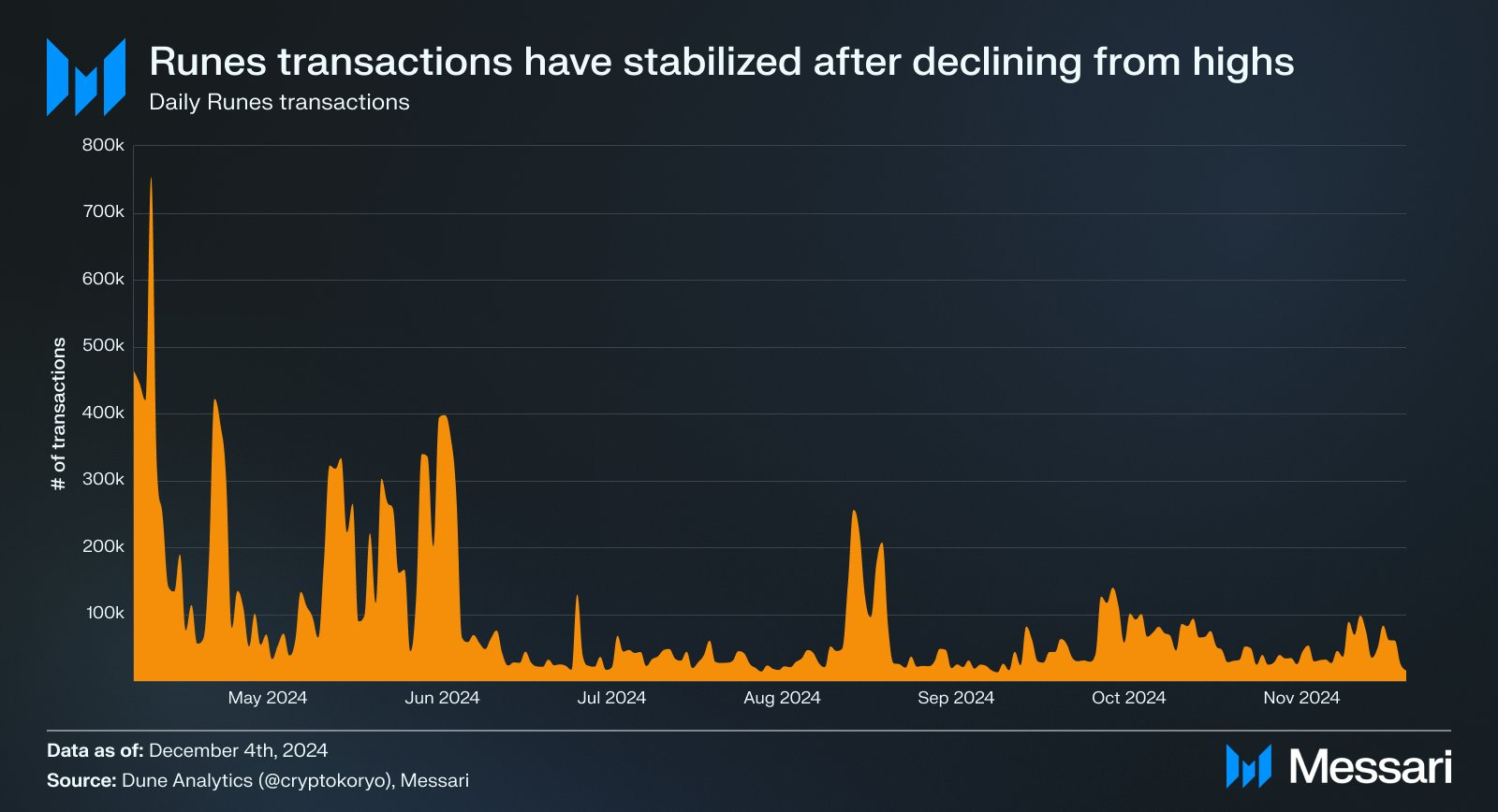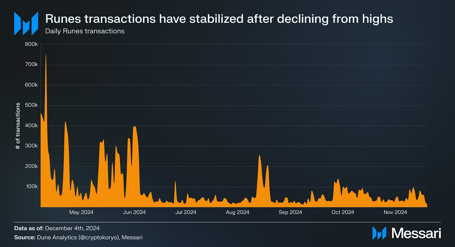 雖然 Runes 的交易量在熱潮過後有所下降,但過去一季內已趨於穩定