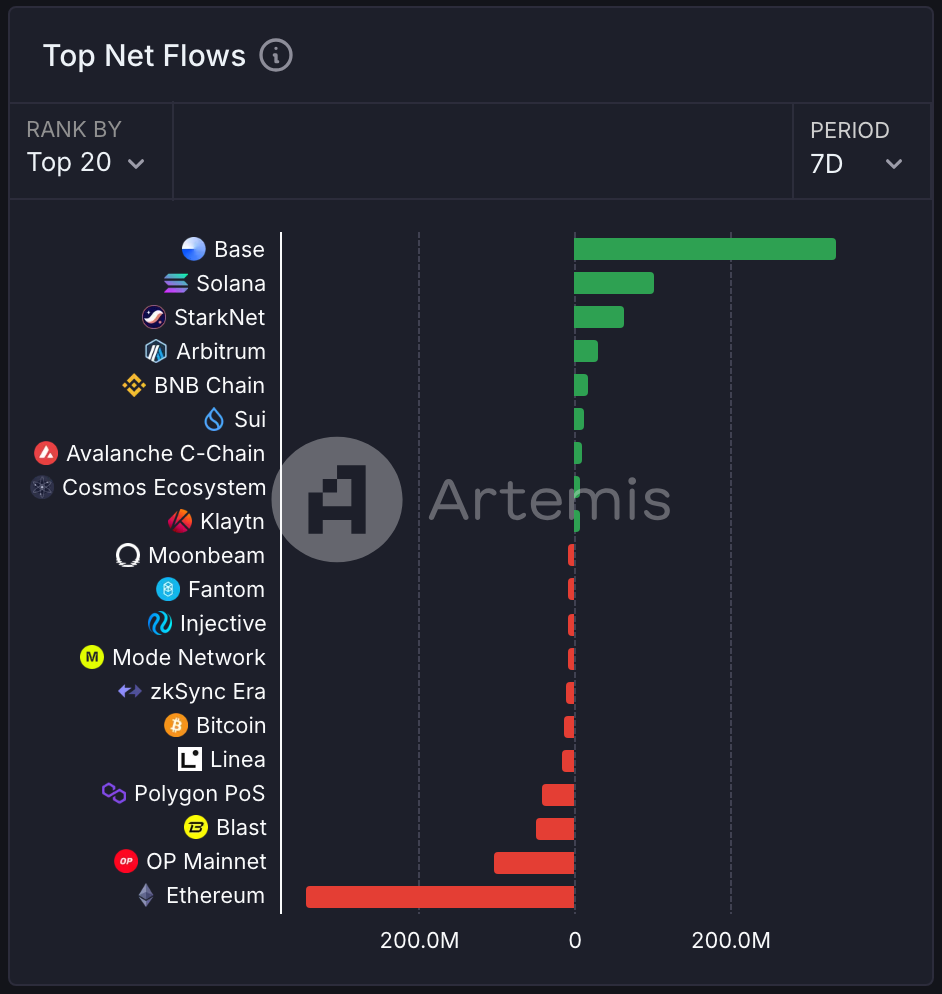Base +3.36 億:Base 持續引領獨特的 DeFi 賽道和 AI Agent 敘事,近期生態中大量相關代幣漲幅驚人,突破近期新高,如 $MORPHO、$AERO、$VIRTUAL、$aixbt 等,。