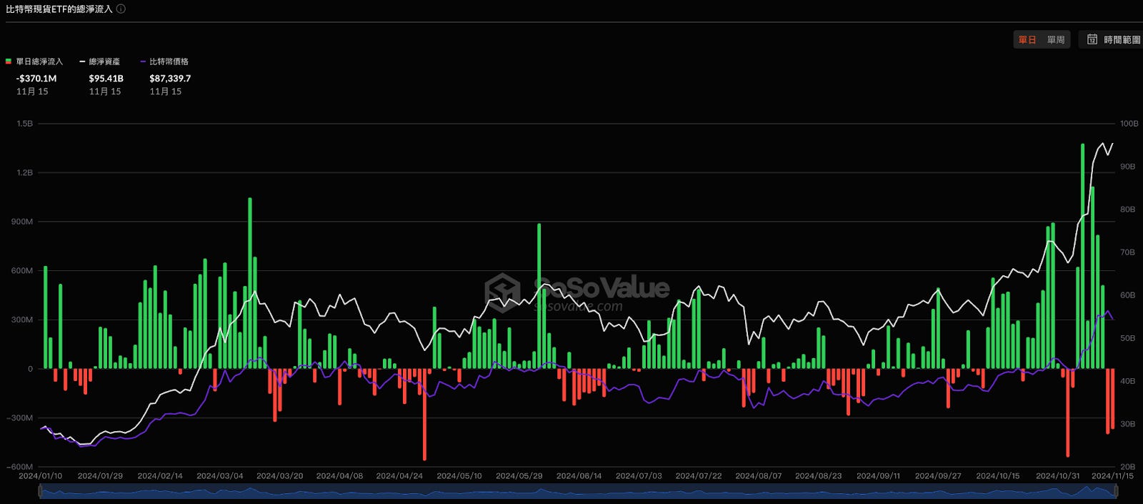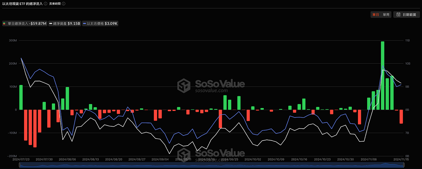 上圖為以日為單位的淨流入圖,本週淨流入的 16.7 億美金,但也出現選舉後首次淨流出,週四週五兩天共流出 7.7 億美元。從 ETF 行情來看,本週發現週一至週三出現美股開盤行情,當日主要漲幅都與美股開盤時間吻合,休盤時間則持續陰跌。