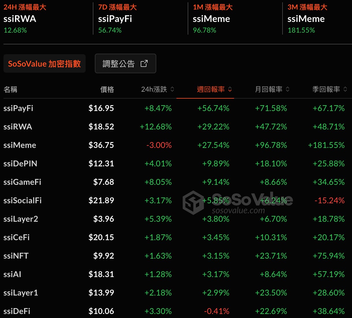 根據 SoSoValue Index,鏈上二級藍籌在數據顯示全線上漲,PayFi、RWA、Meme 尤其強勢,上週漲幅驚人的 DeFi 賽道進入回調,漲勢不再。