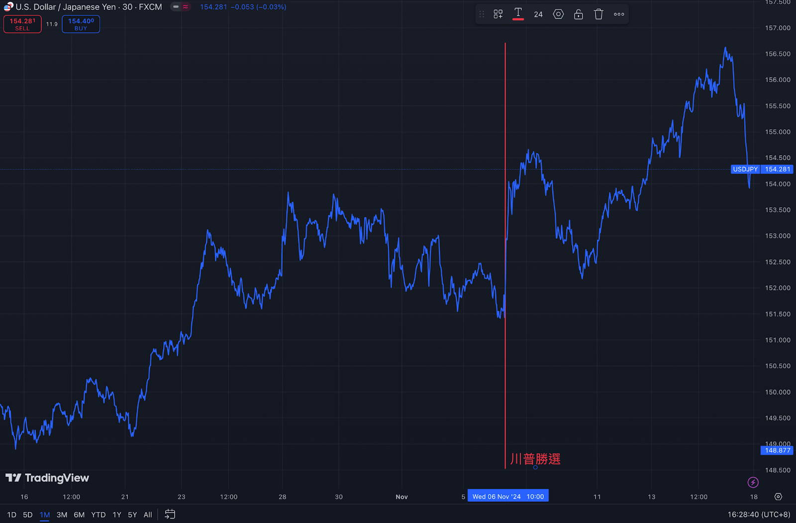 川普上選之後日圓快速走弱,匯率最高達到 156,已逼近日本央行上一次進場干預匯率的水準。11 月 18 日日本央行行長植田和男將發表談話,外界認為日本是否升息的訊號將在此時釋出,將顯著影響日圓匯率以及套利交易(Carry Trade)帶來的資金行情,但可預期影響程度不會像 8 月的情形一樣劇烈。