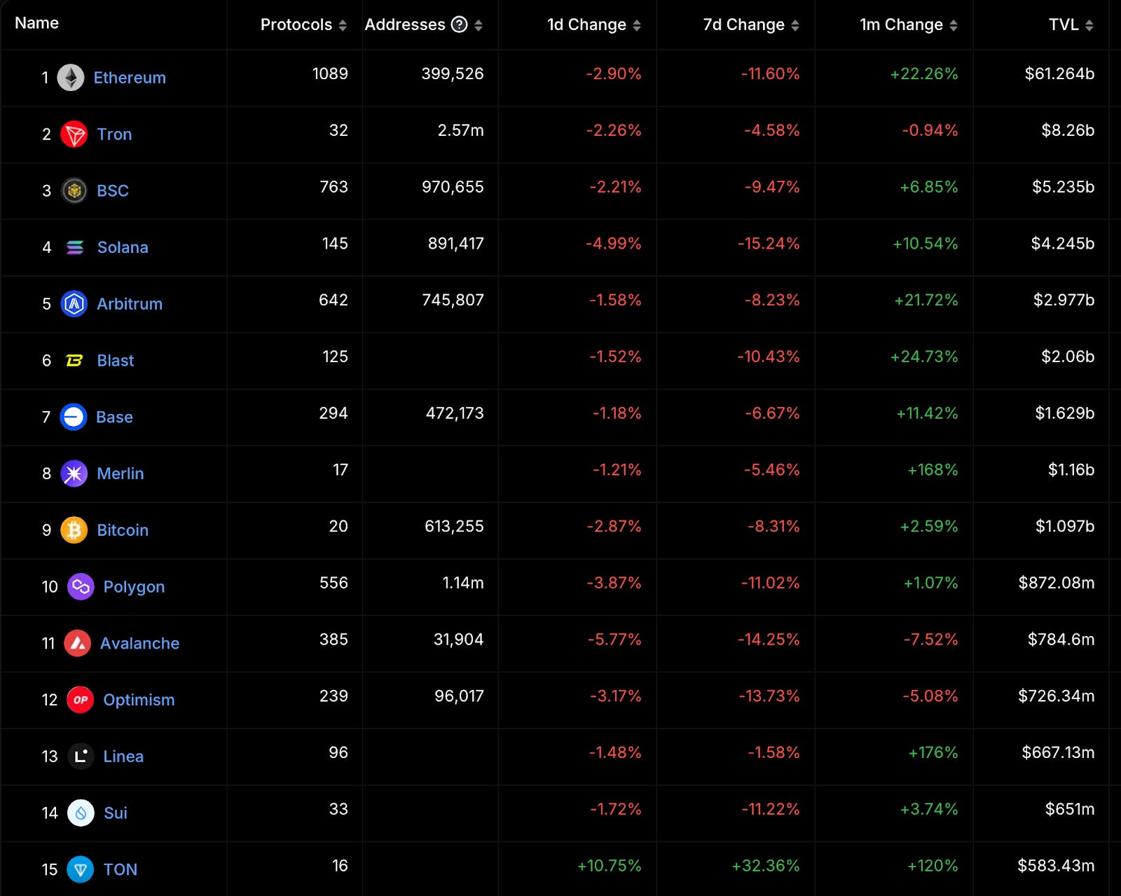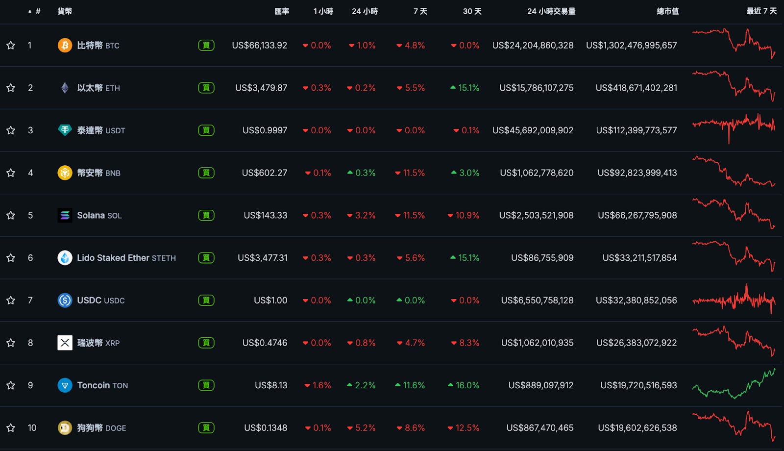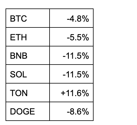 $BNB 回吐上週的強勢漲幅;TON 在本週達歷史新高(All Time High, ATH)後超越 $DOGE 成為第九大幣種,生態日活、TVL 持續上漲。