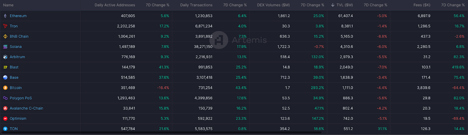 本週 TON 依然領著強勢生態帶動 TVL 爬升,也可以注意到部分支持 Solana 的交易者轉向支持 TON。目前生態中最熱門的 dapp 是結合 Telegram 的點擊型、放置型遊戲,如 Hamster Kombat、FOMO TAP、Catizen,而 DeFi 生態則已有小型的 perp DEX 成形,持續關注是否有更大規模的 GameFi 、SocialFi 或 NFT 項目出現。