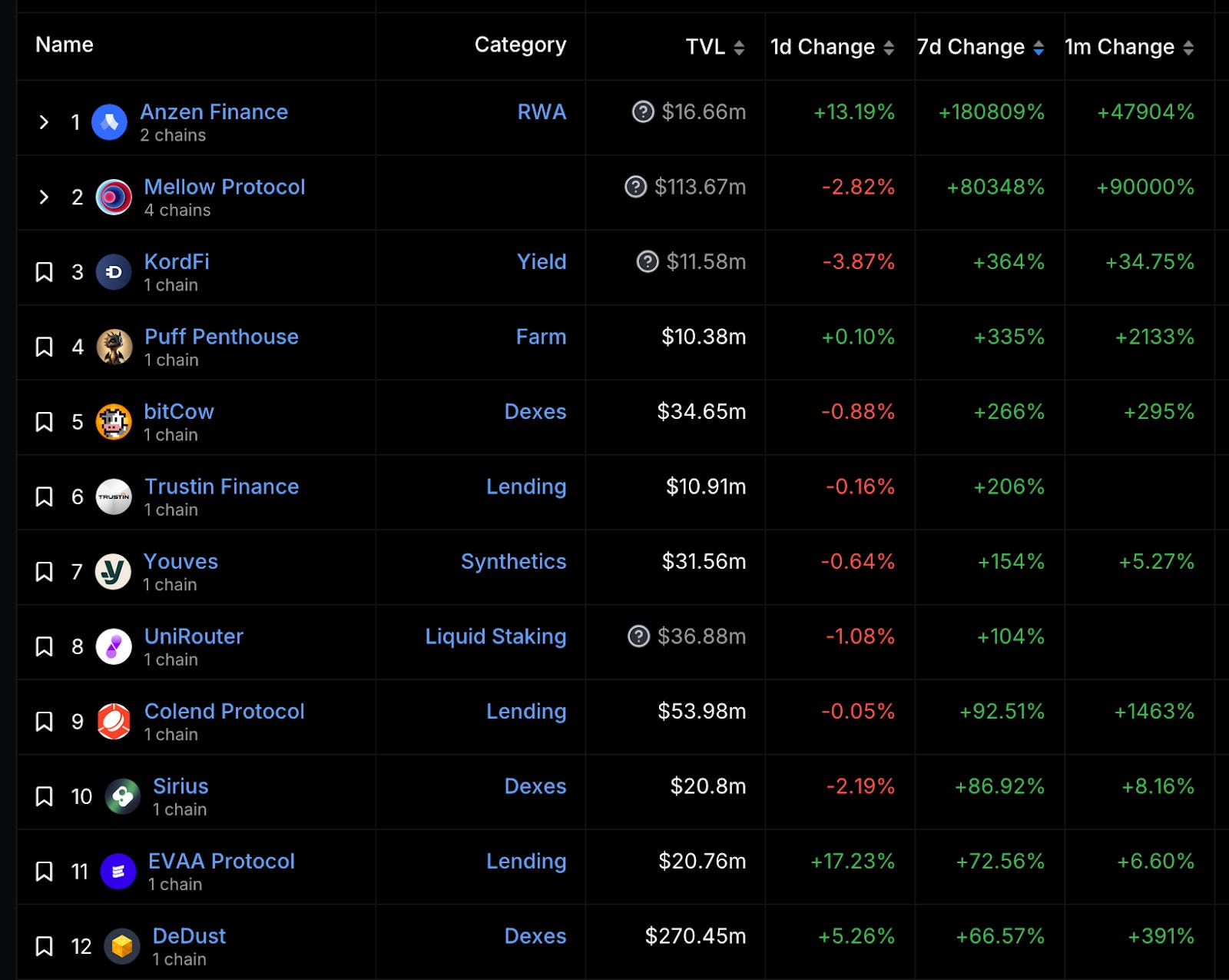 漲幅最大項目(TVL 大於 10M)