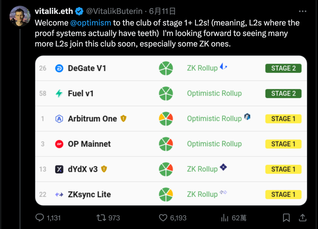 Optimism 更新後成為 Stage 1 Layer 2,往更去中心化的 Stage 2 邁進,得到 Vitalik 特地發推文支持。