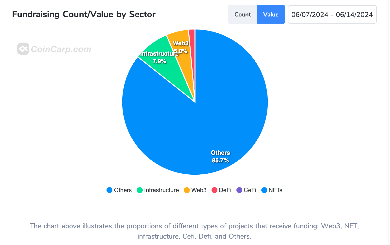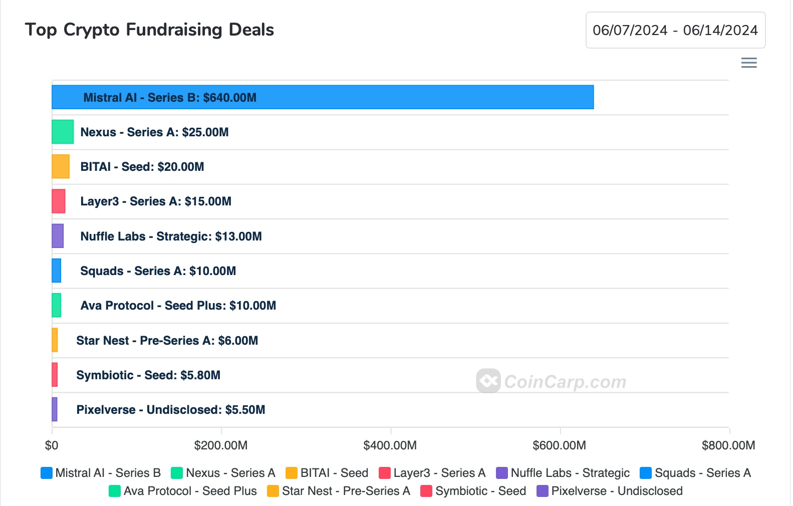 CoinCarp 顯示的本週融資龍頭 Mistral AI(6 億歐元;6.4 億美金) 為 AI 大模型基礎設施,Google Gemini 及 OpenAI 的競品,投資方包含 NVIDIA、三星創投、思科系統、IBM、a16z 等。