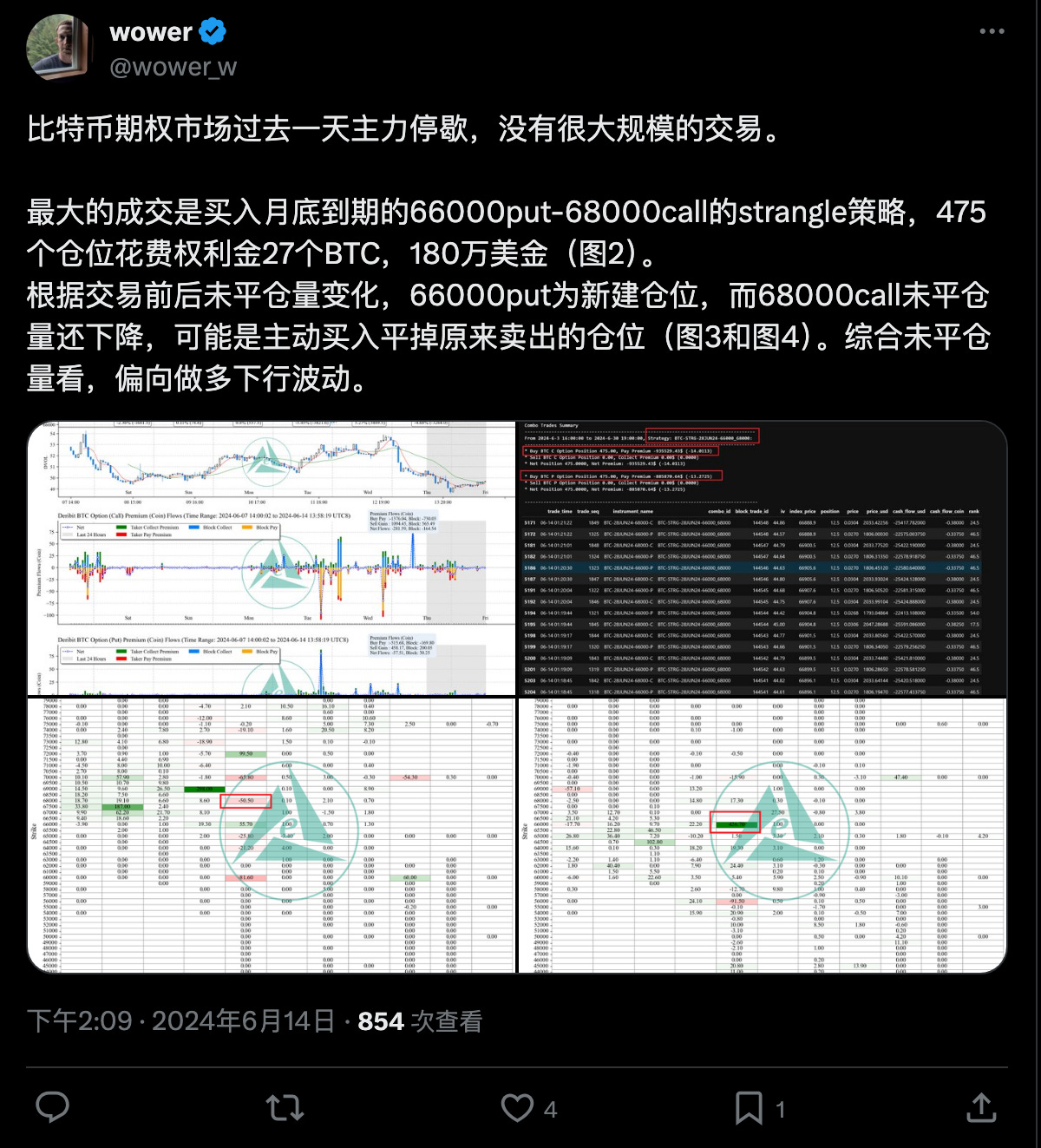 根據期權分析師 wower 最新的推文,短期 BTC 看漲期權的持倉量持續下降;看跌期權持倉量微幅上升,整體傾向看跌。中期以後可以發現年底到期的 BTC 期權仍維持看漲。