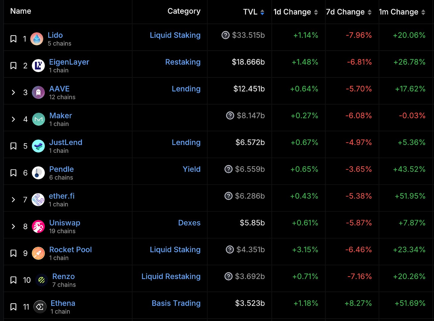 本週因為 ETH 幣價下跌 7%,前十名所有 TVL 均下跌 3-8% 不等,排名 11 的 Ethena 逆勢上漲 8.27%。