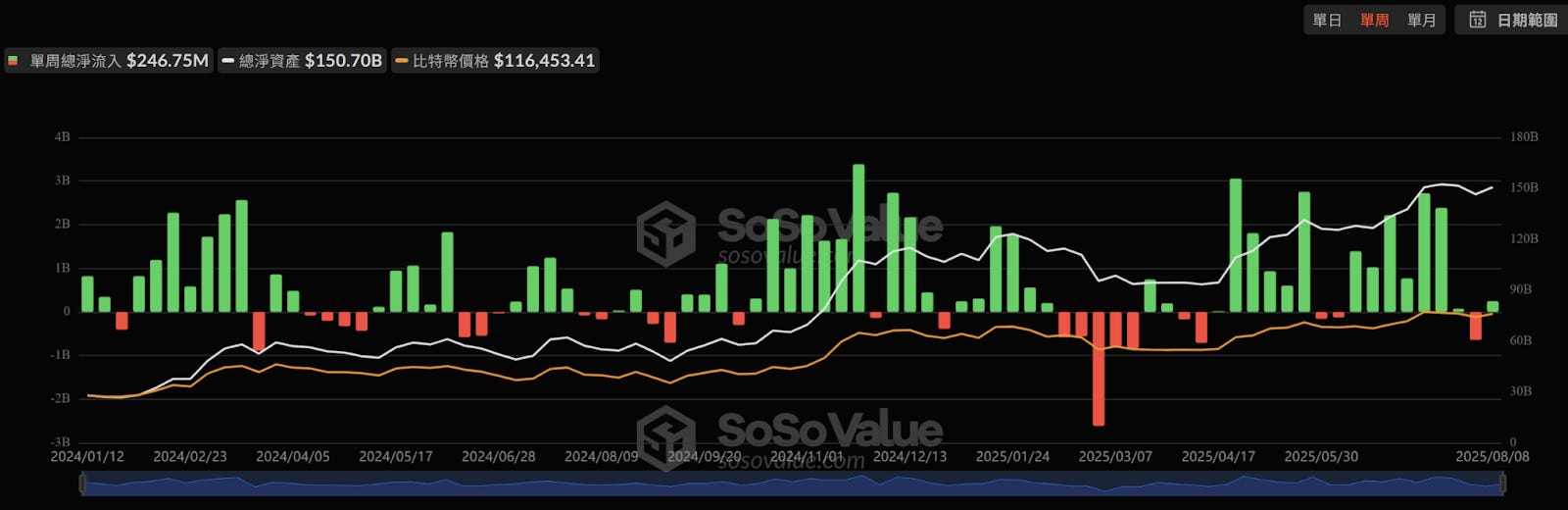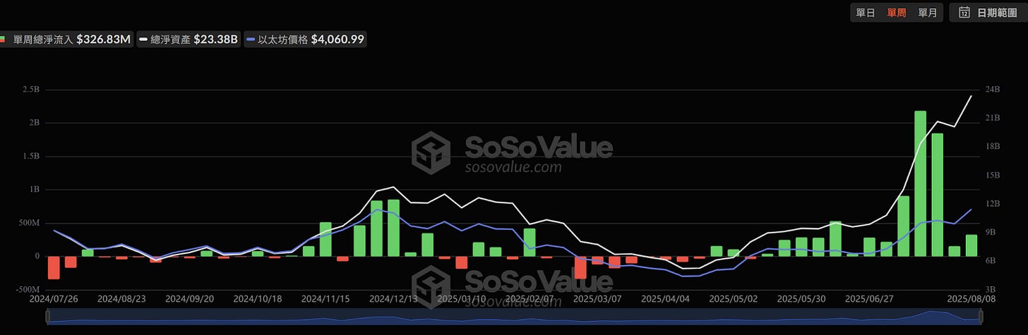 📌ETH ETF 已連續多周資金流入,本周價格上漲主要受益於 Fundamental Global 向 SEC 申請發行 50 億美元以太坊證券,增強了市場中長期信心。BlackRock 與 Fidelity 等機構大舉買入,推動 ETH 價格回升至 4,000 美元以上。資金連續流入 3 至 4 天,8 月 7 日單日淨流入達 2.22 億美元,顯示機構認可度與投資熱情持續高漲,後市看漲態勢明顯。